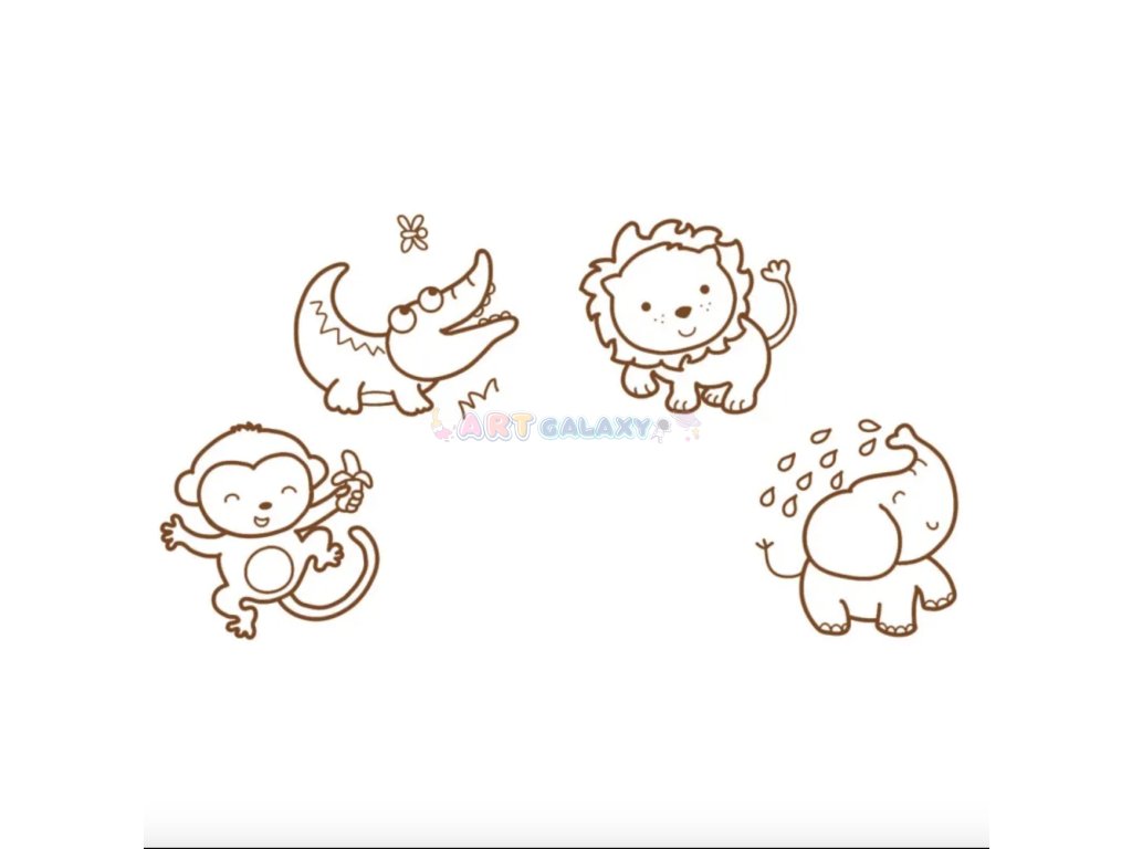 - Roztomilé safari motivy – slon, lev, opička a krokodýl