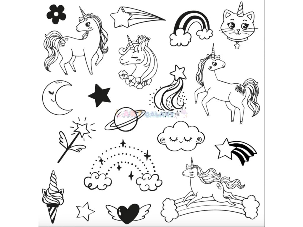 - Počet razítek: 21 ks (jednorožci, duhy, hvězdy, srdíčka)