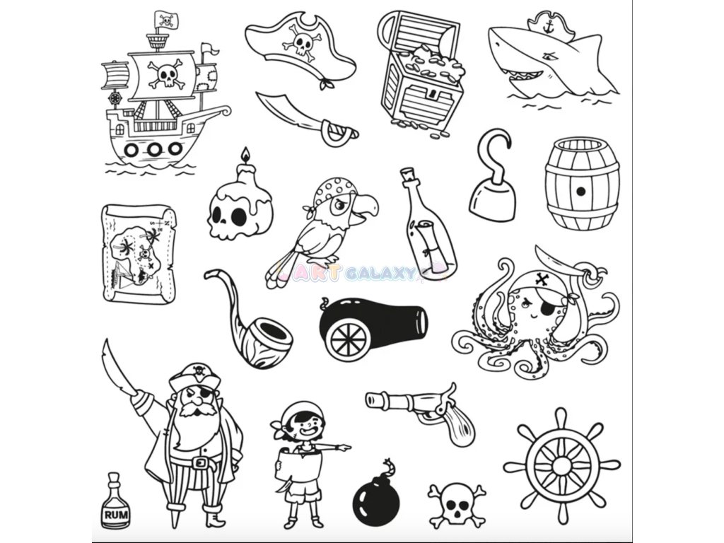 - Počet razítek: 21 ks (piráti, lodě, poklady, lebky, kotvy, mořské motivy)