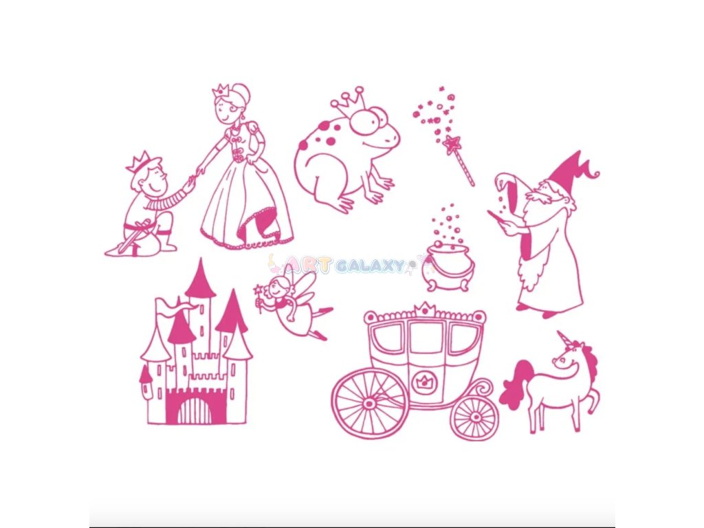 Tematická kreativní sada značky Aladine obsahuje 10 ks gumových razítek na pěnové hmotě s motivy Pohádek a s černým razítkovacím polštářkem.