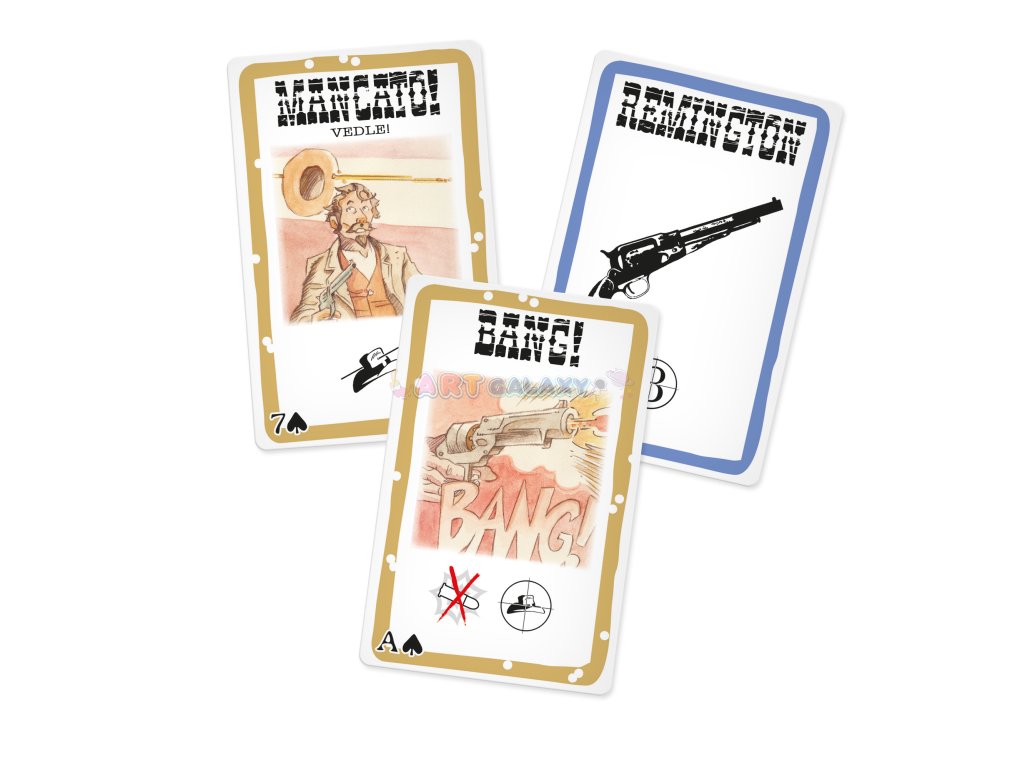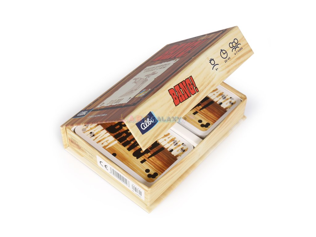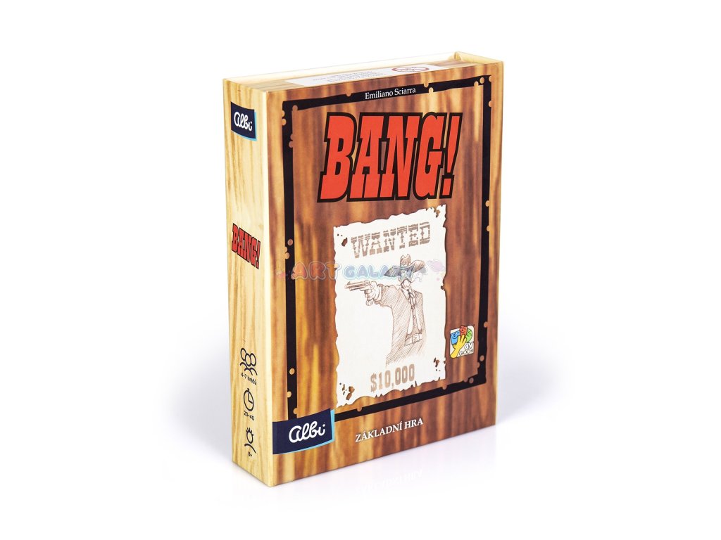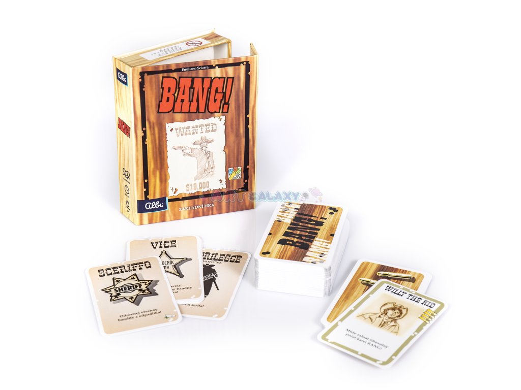 Bang! - karetní hra, která vás dostane! Bang, bang, bang! Bandité honí šerifa. Šerif pálí po banditech. Odpadlík kuje pikle chvíli tam a zase tady. Kulky sviští kolem uší. A kdo z hráčů je pomocník šerifa, připraven za něj položit život? A kdo je bezcitný bandita, který si přeje šerifův konec? Pokud to chcete zjistit, taste své zbraně (tedy karty)! Ve hře Bang! je důležité sledovat ostatní hráče, abyste včas odhalili hráčovu identitu.