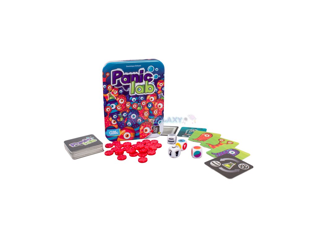 V laboratoři je trochu chaoz. Budete dostatečně rychlí a podaří se vám najít tu správnou laboratorní potvoru jako prvním? Panic Lab je postřehová hra s tvory, kteří mají tu jedno oko, tu chapadla. Při hře Panic Lab se hraje se čtvercovými kartičkami rozmístěnými do kruhu. Na kartičkách jsou laboratorní obludky různých tvarů, barev a vzorů. Dále na nich lze nalézt vyobrazené laboratoře a ventilace. Cíl hry je jasný - nalézt na základě čtyř vržených kostek tu správnou obludku. Důležitou roli zde hraje kostka laboratoře. Ta určuje, ze které laboratoře obludka utekla a jakým směrem se vydala. Pak již stačí najít obludku určenou třemi zbývajícími kostkami (kostka tvaru, barvy, vzoru). Aby hraní nebylo tak jednoduché, vstupují do hry kartičky ventilace, do nichž obludky rády sklouzávají. Při hraní navíc mohou procházet mutačními komorami, a tak třeba měnit svou barvu (ale i tvar či vzor). Hráč, který jako první najde v daném kole tu správnou obludu, získává žeton jako bod. Pokud se hráč při hledání splete, musí žeton naopak odevzdávat. Vítězí samozřejmě hráč s nejvyšším počtem žetonů na konci hry. Panic Lab je poťouchlá postřehovka, která vás rozhodně nenechá v klidu. Sympatické na ní je, že není - jako většina postřehových her - založena na vykládání karet. Stejně jako ony je ale v podstatě univerzální - mohou ji hrát jak dospělí, tak děti či třeba hráči odlišných věků a zkušeností. Karetní hra Panic Lab je uložena v luxusní plechové krabičce, která je uvnitř sametově polstrovaná. Jde tak nejen o praktické balení, ale i balení, které opravdu úžasně vypadá.