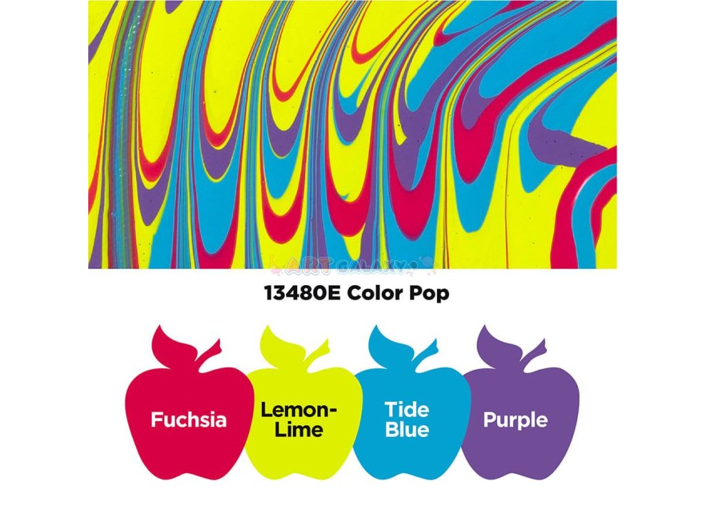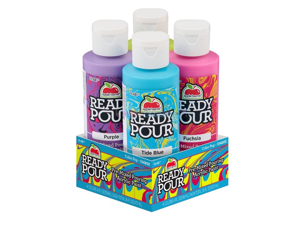 Apple Barrel Ready Pour™ Color Pop Set je sada čtyř předem namíchaných akrylových barev, ideální pro začátečníky. Vytváří výrazné a odvážné mramorové efekty bez potřeby míchání. Barvy po zaschnutí poskytují jemný saténový povrch a jsou netoxické.