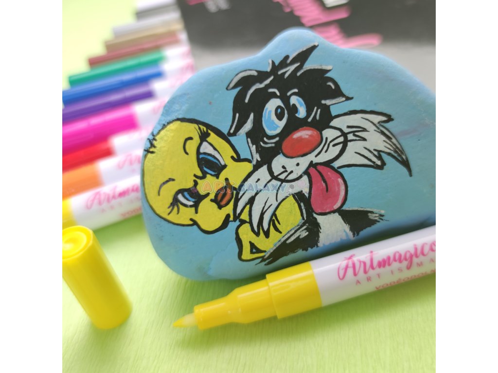 Akrylové fixy zn. Artmagico s extra jemným hrotem o šíři 0,7 mm a inkoustem prémiové kvality nabízíme v sadě 12 ks. Základní paletu barev, nejkvalitnější hrot a dokonale krycí inkoust v lesklých barvách si oblíbí každý umělec! Luxusní akrylové fixy Artmagico jsou velmi oblíbené zejména pro malování na kamínky. Artmagico nabízí fixy nejvyšší kvality v elegantním designu. Plynulý tok barvy zajišťuje kvalitní inkoust na vodní bázi. Inkoust je rychleschnoucí, trvalý, bez zápachu a zároveň netoxický. Barvy zůstávají po uschnutí hladké, lesklé a neprůhledné na všech typech povrchů. Hroty popisovačů Artmagico jsou ideální na detailní práci i vymalování menších ploch. Díky kombinaci vlastností popisovačů Artmagico budou Vaše výtvory vždy dokonalé.