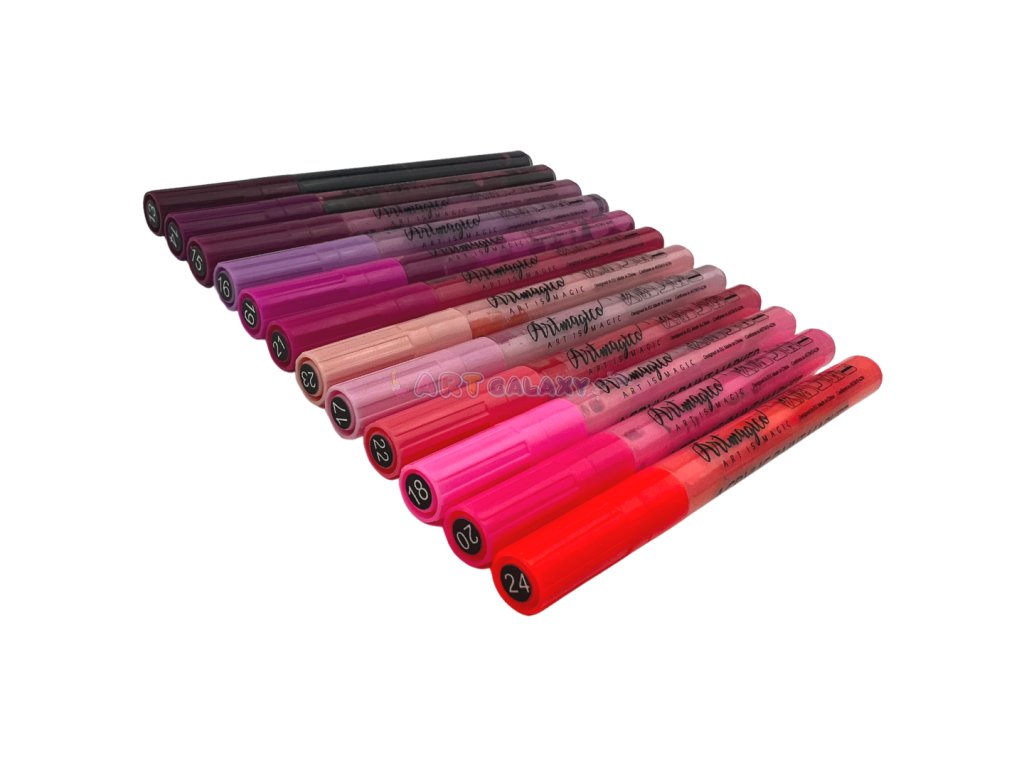 Artmagico nabízí moderní akrylové popisovače, jež jsou plněny kvalitním italským inkoustem a jejichž hroty jsou vyrobeny v Japonsku a jsou zárukou kvality a dlouhé životnosti. Barva inkoustu má vysokou krycí schopnost, je voděodolná a světlostálá, nedochází k jejímu blednutí, barvy zůstávají jasné a je možné je vzájemně míchat a tvořit tak další barevné odstíny. Díky konzistenci inkoustu je možné stínovat také za pomocí vlhkého štětce a dát tak malování s fixy nový umělecký rozměr.