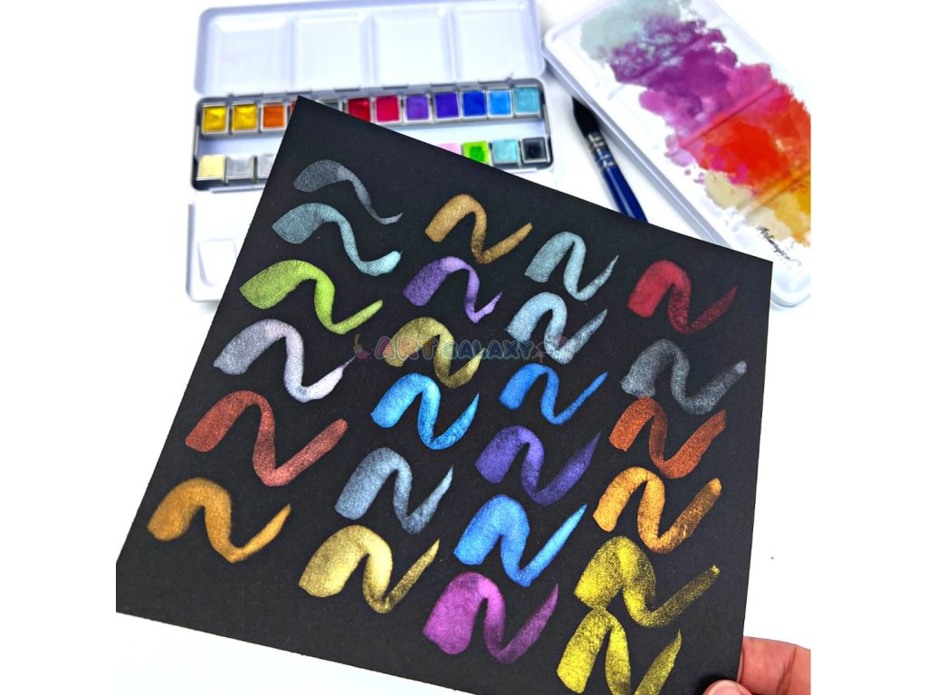 - profesionální akvarelové barvy s perleťovými odstíny