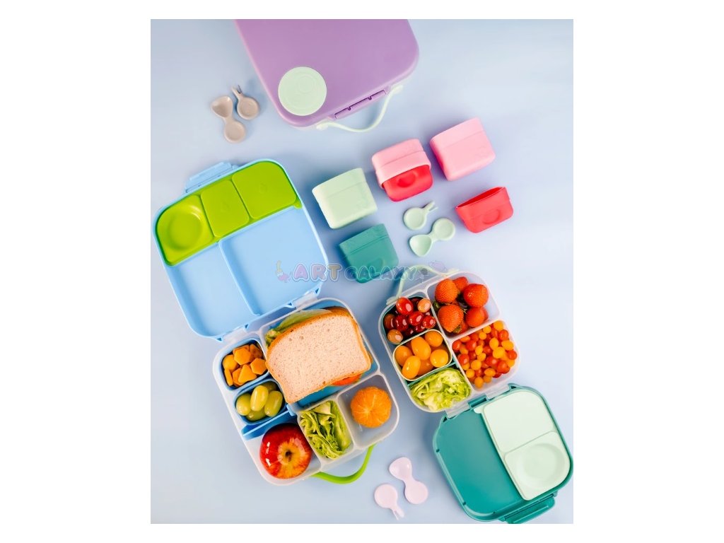 - b.box Svačinové boxy: Boxy s oddělenými přihrádkami a integrovanými příbory pro snadnou a praktickou konzumaci jídla.