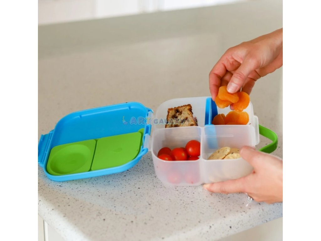 Krabička je vybavena oddělenými přihrádkami, které pomáhají udržet potraviny čerstvé a nesmíchané. Vyjímatelné přepážky umožňují přizpůsobit vnitřní prostor podle toho, co si děti nebo dospělí zvolí do svačiny. Například lze oddělit ovoce od sendviče nebo zeleninu od dezertů, což zajišťuje, že jídlo zůstane chutné a svěží.