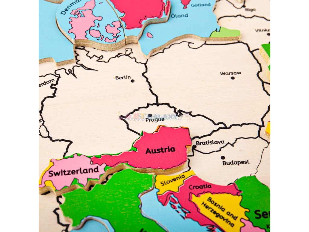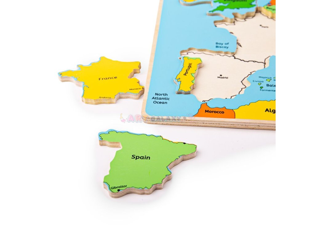 Tato fantastická mapa Evropy zajisté okouzlí zvědavé děti, které se naučí, jak je Evropa spojená. Děti se učí složení Evropy pomocí umísťování jednotlivých dílků na základní desku. Každý díl vkládačky je na ní vyznačen.