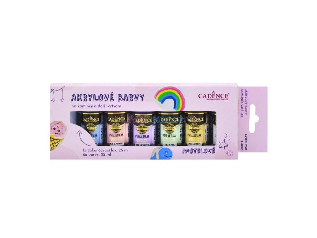 Akrylové barvy značky Cadence v pastelových odstínech v sadě po 6 ks včetně akrylového laku k fixaci. Kvalitní syté a vysoce krycí barvy. Vhodné pro malování na kamínky.