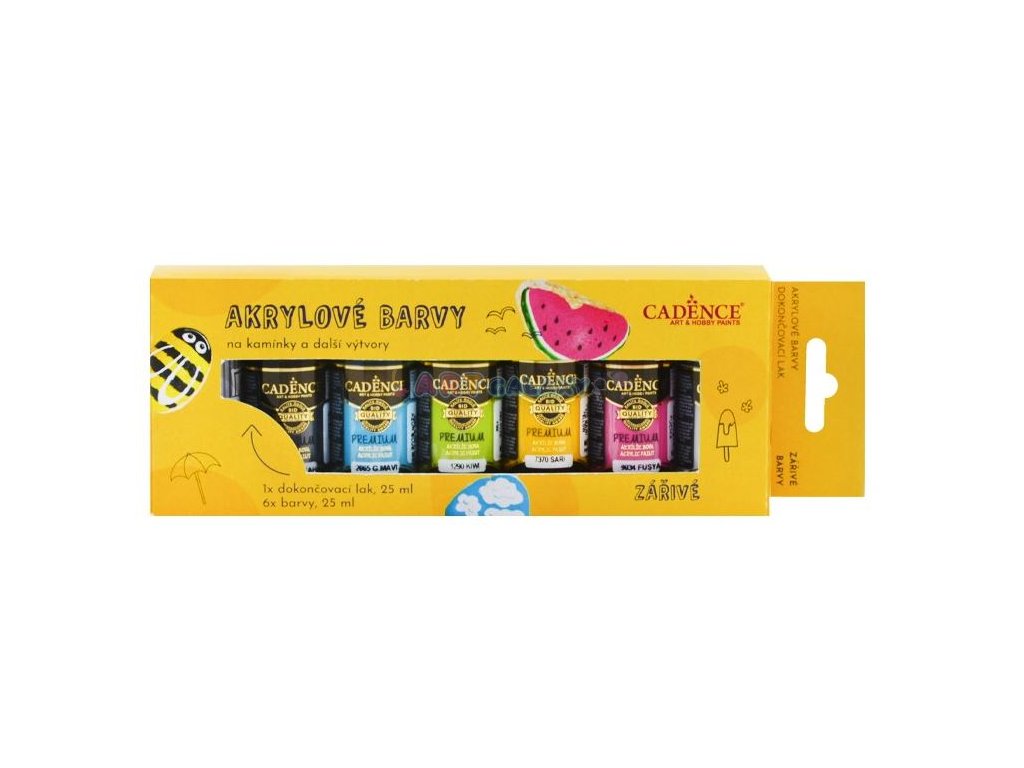 Akrylové barvy značky Cadence v zářivých odstínech v sadě po 6 ks včetně akrylového laku k fixaci. Kvalitní syté a vysoce krycí barvy. Vhodné pro malování na kamínky.