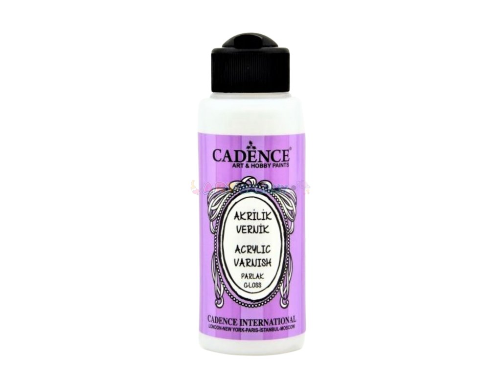 Dokončovací akrylový lak Acrylic Varnish značky Cadence vytváří ochranu v podobě voděodolného povrchu, nanáší se štětcem. Je transparentní, bezbarvý a vytváří vysoce lesklý povrch. Je vhodný na dřevo, kov, kámen, keramiku, polyester a další povrchy, není vhodný na krakelované výrobky. Před použitím dobře protřepejte. Nátěr se provádí štětcem. Doporučují se alespoň 2 vrstvy nátěru. Mezi jednotlivými vrstvami počkejte 30 minut. Doba schnutí prvni vrstvy nátěru po je přibližně 15 minut. Lakovaný povrch získá voděodolné vlastnosti. Chráněné povrchy lze snadno čistit vlhkým hadříkem. Neobsahuje žádné toxické látky.