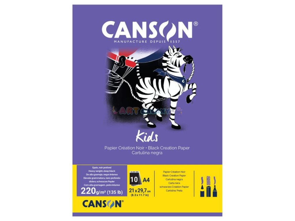 Skicák Canson Kids je blok s 10 černě zbarvenými listy, které jsou vhodné pro kreslení, lepení, stříhání a jinou kreativní tvorbu nejen pro děti. Skicák vysoké kvality má papír barvený do vlákna a díky své černé barvě je ideální na kontrastní tvoření - např. akrylovými brush peny v metalických odstínech, gelovými pery, ale také pastelkami či bílou křídou a pastely.