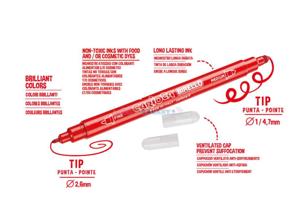 - Carioca Fixy: Dermatologicky testované fixy s sytými barvami, snadno omyvatelné.