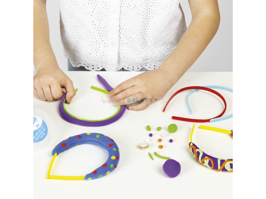 - sada obsahuje komponenty na výrobu náušnic a čelenek, modelínu (dva kalíšky po 30 g), tvarovací tyčinku a návod krok po kroku