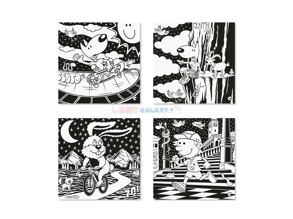 Zábavné omalovánky značky Carioca obsahují 4 listy k vymalování. Jsou jedinečné tím, že mají černé stránky, které jsou neobvyklé pro dětské omalovánky, lépe rozvíjí fantazii a barvy skvěle vyniknou. Originální design omalovánek navrhl graffiťák a ilustrátor Cento Canesio!