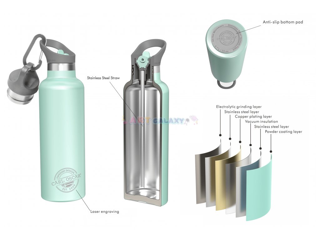 Je vyrobena z vysoce kvalitní potravinářské nerezové oceli 18/8, která udrží vaše nápoje studené až 24 h a horké až 14 h. Práškové lakování znamená snadné uchopení například s mokrýma rukama a mimořádnou odolnost láhve. Je také vybavena protiskluzovou podložkou ve spodní části.