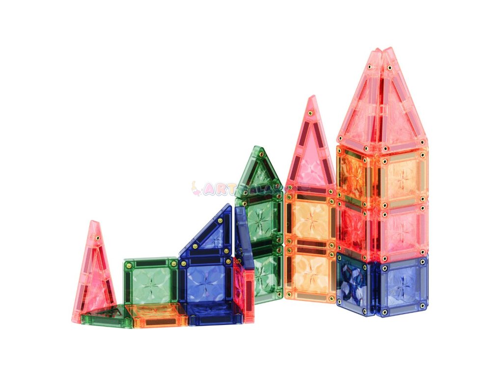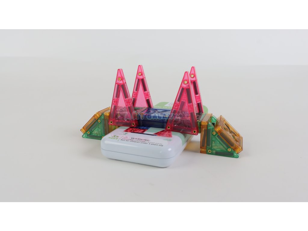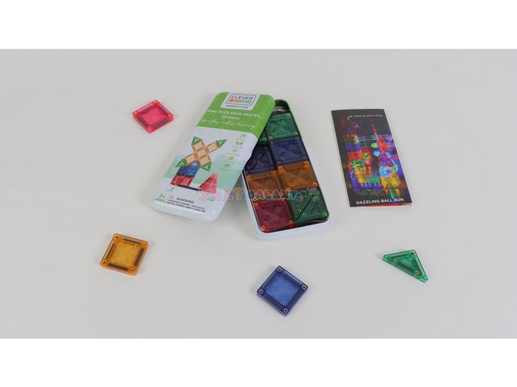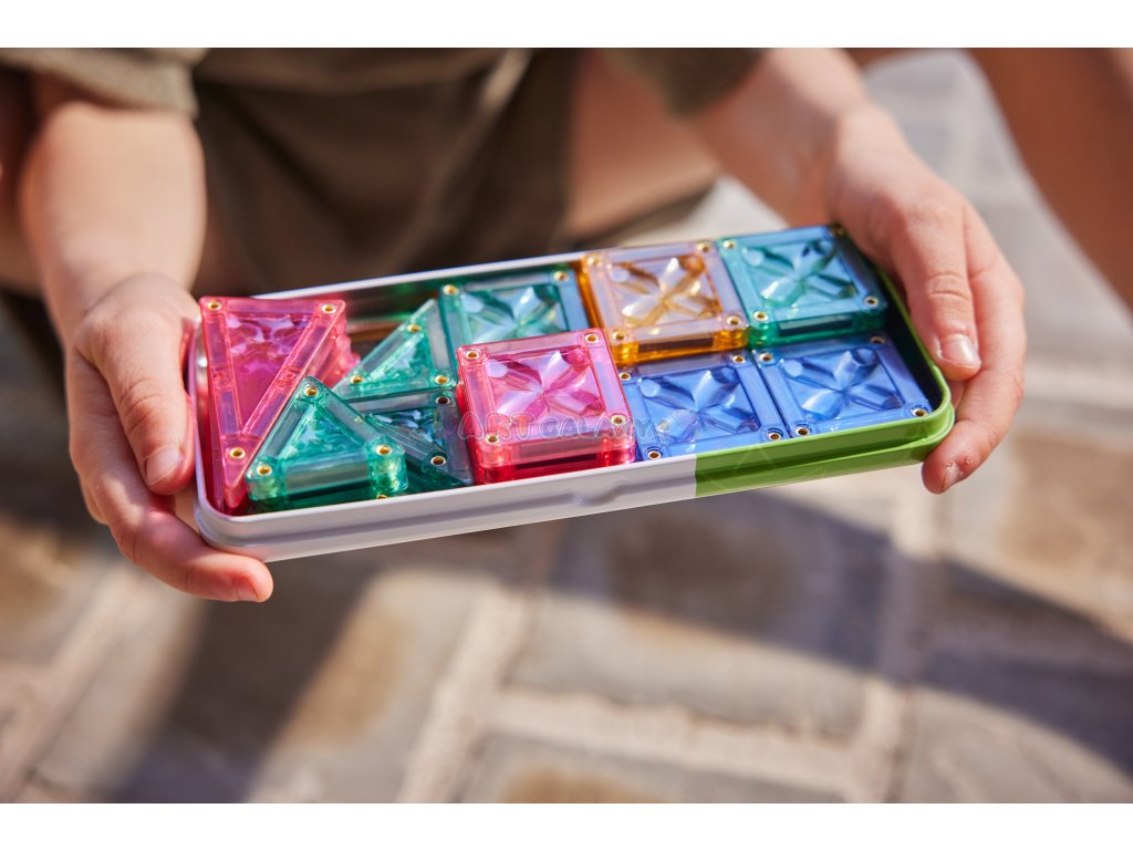28 mini magnetických destiček je uloženo v kovové plechovce, která udrží všechny vaše mini stavby ve vzpřímené poloze a neporušené i na cestách.