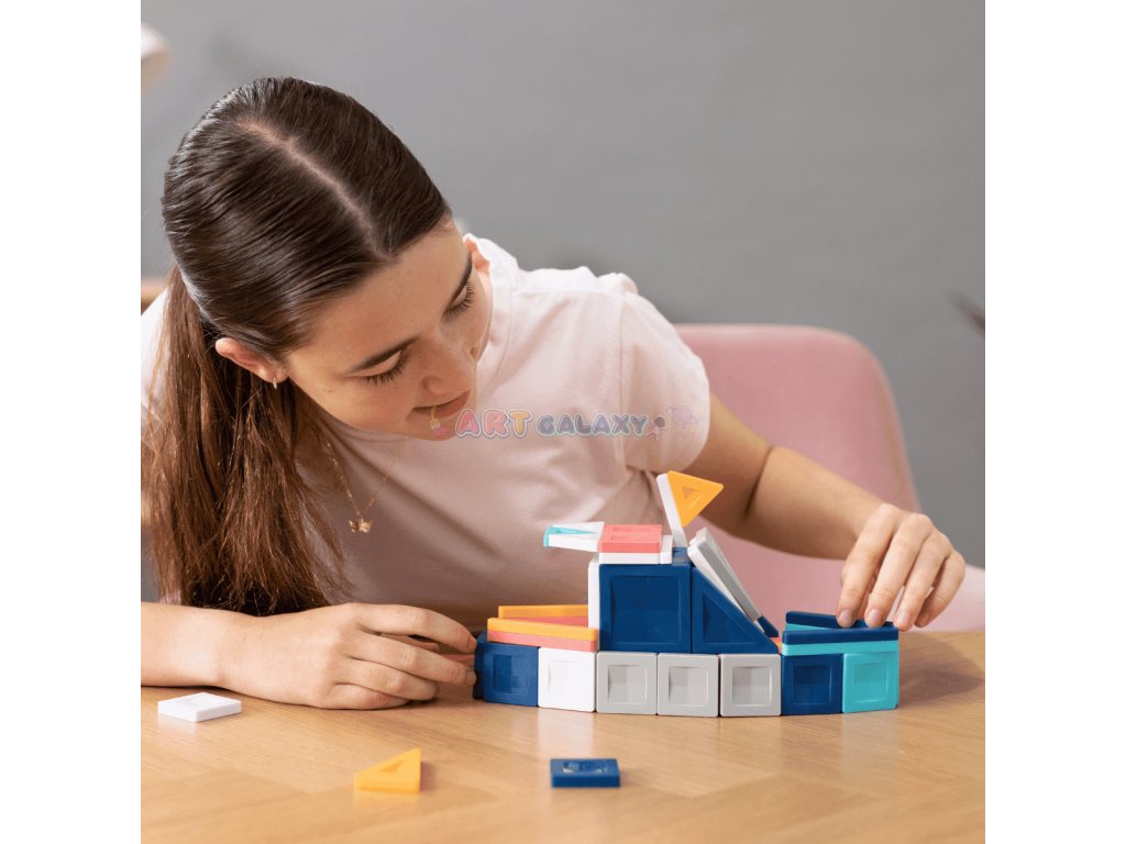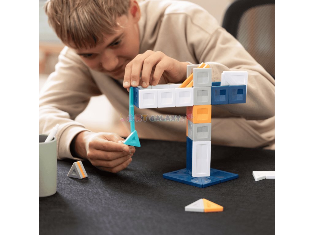 Díky kombinaci čtverců a trojúhelníků je možné postavit i realistické stavby, jako jsou garáže, mosty nebo garážové rampy pro autíčka. Sada zároveň umožňuje experimentovat s tvary a symetrií – děti objevují, jak funguje rovnováha, gravitace a geometrie v praxi.