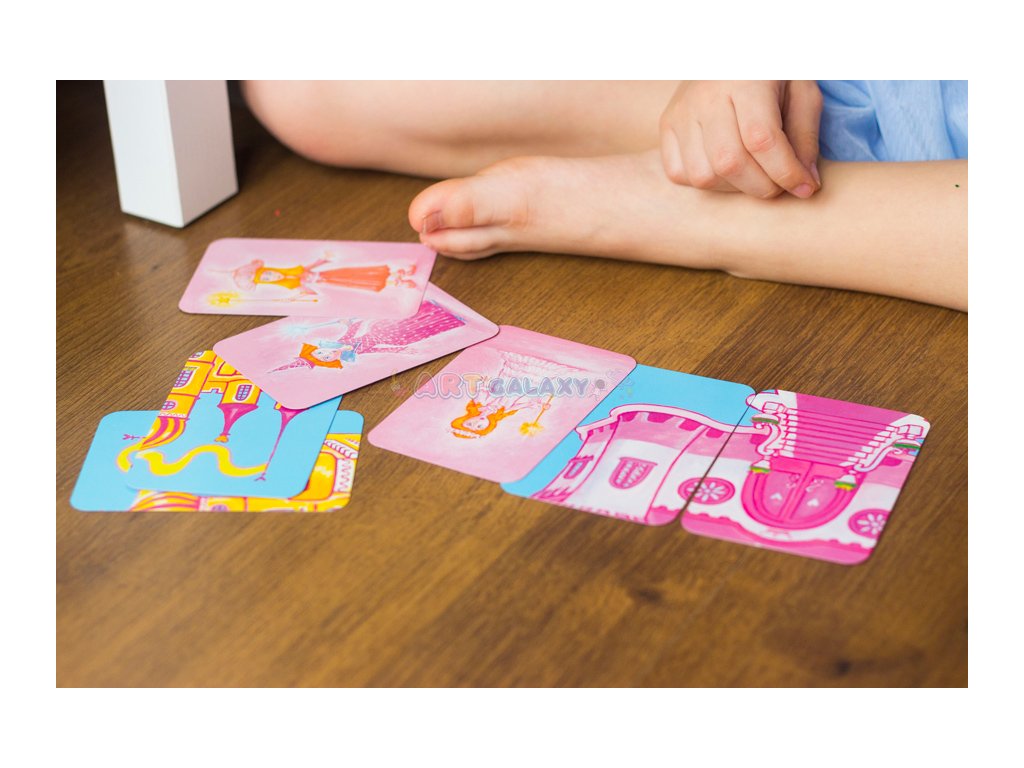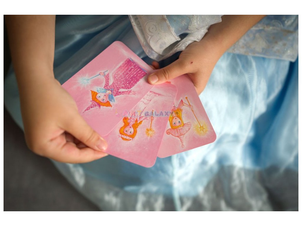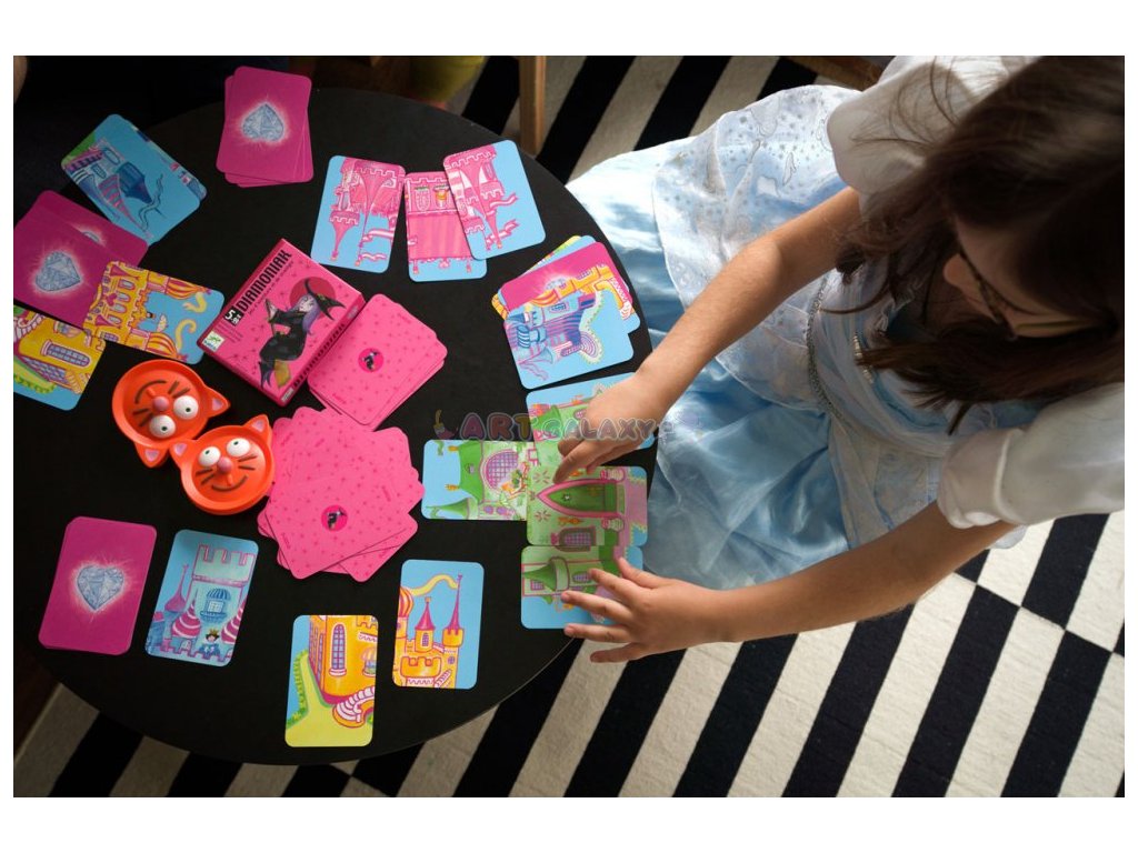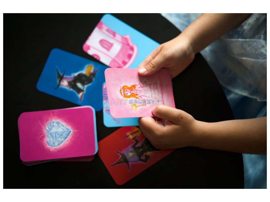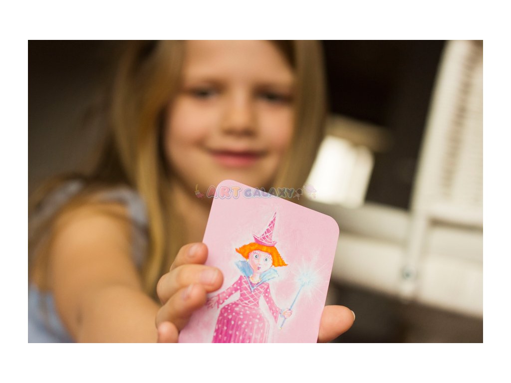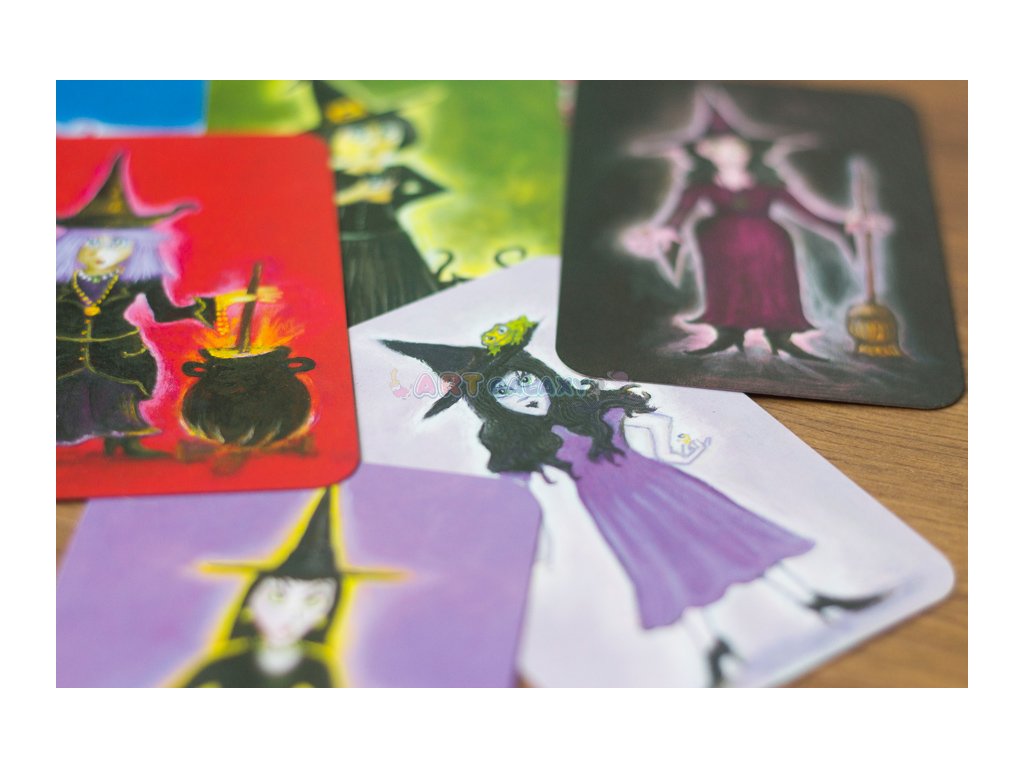 V balení najdete celkem 55 karet rozdělení do čtyř kategorií - čarodějky, víly, diamanty a zámky. Pokud si hráč vylosuje čarodějku, musí ji vrátit a s ní další tři karty nebo kartu víly, která ho zachrání. Za diamantové karty si od hráče kupuje tu část zámku, která mu chybí.