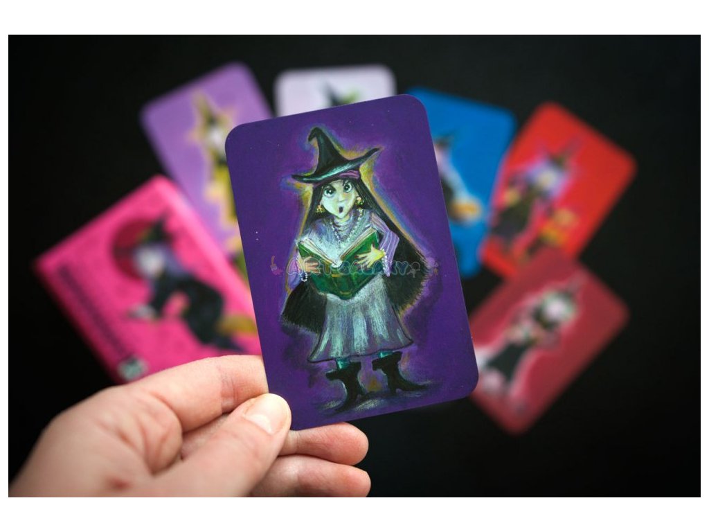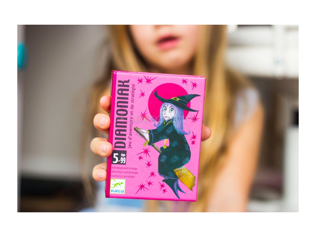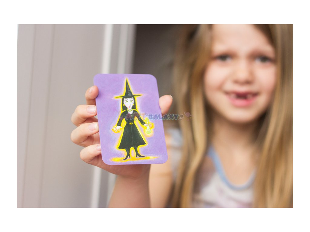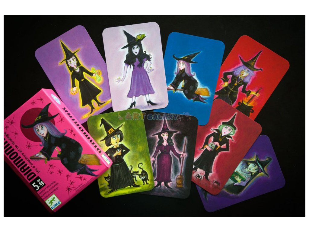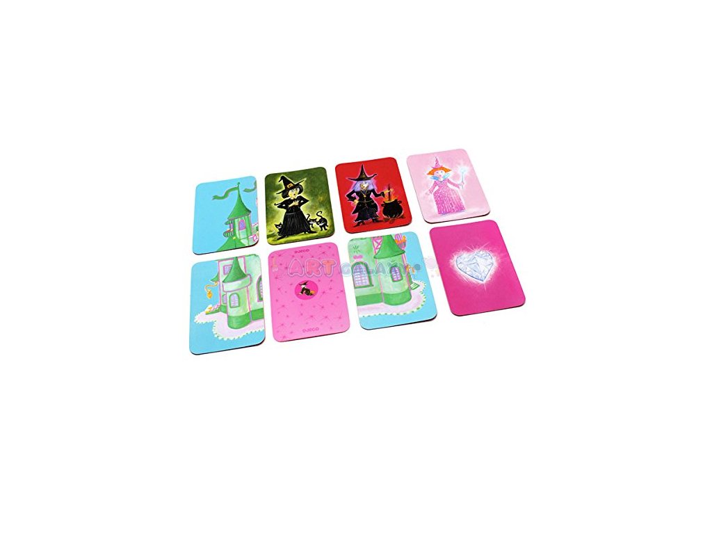 Nádherně ilustrovaná karetní hra. Karetní hra – Djeco – Čarodějky je vhodná pro děti od 5 let. Vítězem se stává ta čarodějka, která si jako první postaví z dílků karet svůj zámek. Čarodějky kupují a vyměňují ty díky hradu, které jim chybí a musí se chránit před útoky ostatních čarodějek.