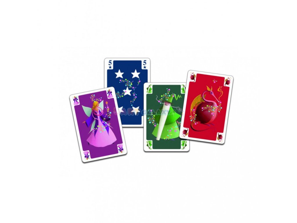 V balení je celkem 47 karet, 40 v barvách (zelená, modrá, červená, fialová) – v každé barvě je 10 karet (1 – 7, drak, víla, čaroděj). Pusťte se do toho!