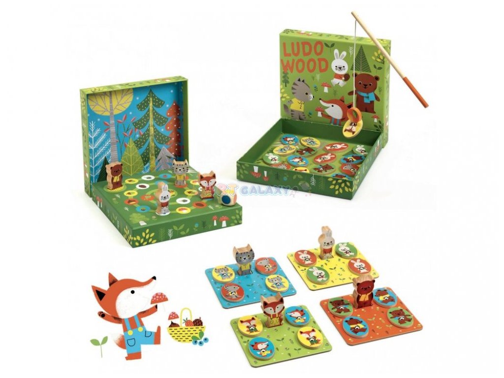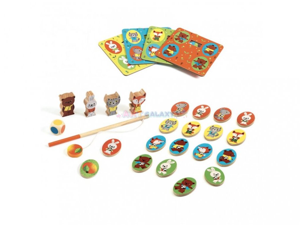 Set obsahuje 4 hrací esky na hru loto, 4 dřevěné figurky na cestičky, kostku, 16 dřevěných žetonů na pexeso a magnetickou udici.