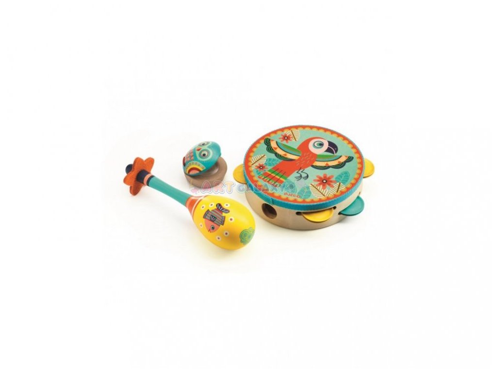 Set hudebních nástrojů obsahuje tamburínu, kastaněty a hudební paličku pro malé i velké hudebníky.