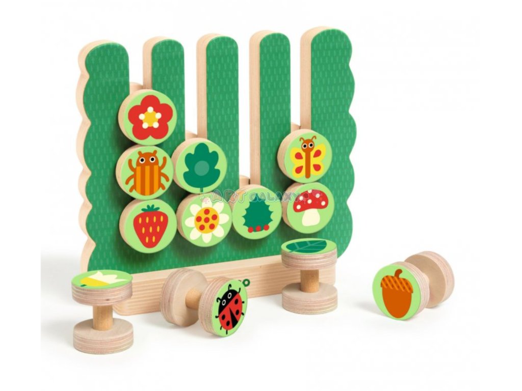 Vyberte si kartu, vyberte správné dřevěné dílky a zasouvejte je na destičku tak, jak je zobrazeno na kartě. Ale počkejte, není to tak snadné, jak to zní! Dílky mají na každé straně trochu jiné obrázky.