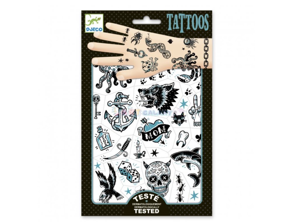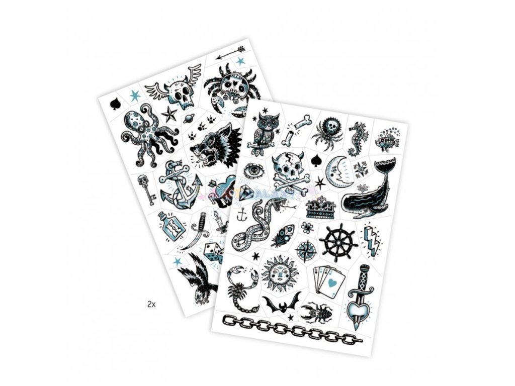 Nádherné tetovačky značky Djeco v designu drsných motorkářů a temných sil, které potěší všechny kluky a drsné holčičky. Jednotlivé obrázky jsou předem oddělené čárami, stačí si jen zvolit obrázek a vystřihnout ho. Následně na část těla, kterou chcete potetovat, přiložte obrázek bez fólie. Obrázek namočte, chviličku vyčkejte a opatrně sundejte papír. Obrázek zůstane na kůži, nechcete zaschnout a parádní tetovačka pro drsňáky je na světě!