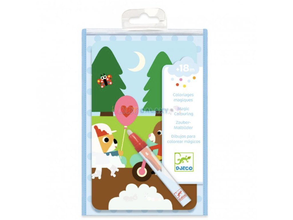 Vodní omalovánky značky Djeco jsou ideální děti od 18 měsíců. Díky vodnímu peru se objeví obrázek, po uschnutí vody lze omalovánky znovu použít. Malování vodou je zábavná činnost, která baví každé dítě. Balení obsahuje 4 ilustrace a jednu magickou vodní tužku. Obrázek se po přetřením magické tužky jako zázrakem objeví, poté ho stačí vysušit a děti mohou malovat stále dokola.