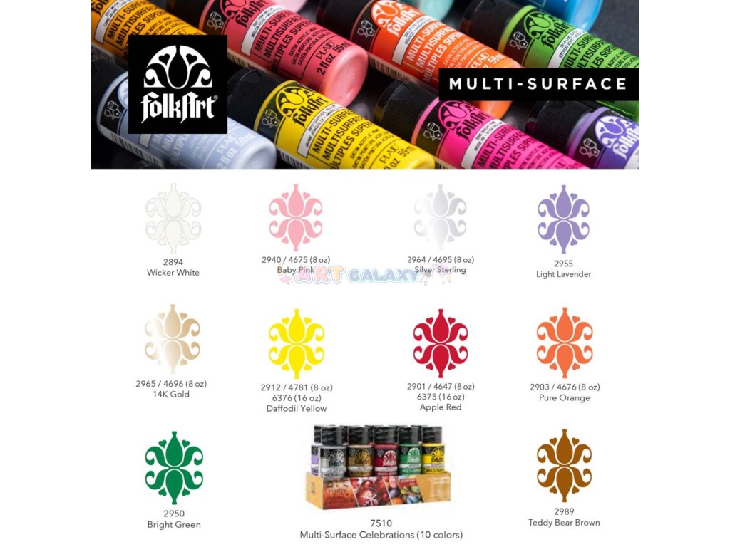 FolkArt 10-piece Celebration Multi-Surface Basics Acrylic Paint Set nabízí 10 všestranných barev s krémovou konzistencí a saténovým finišem. Tato sada je ideální pro všechny vaše kreativní projekty na různých površích, včetně dřeva, plátna, skla, textilu a keramiky.