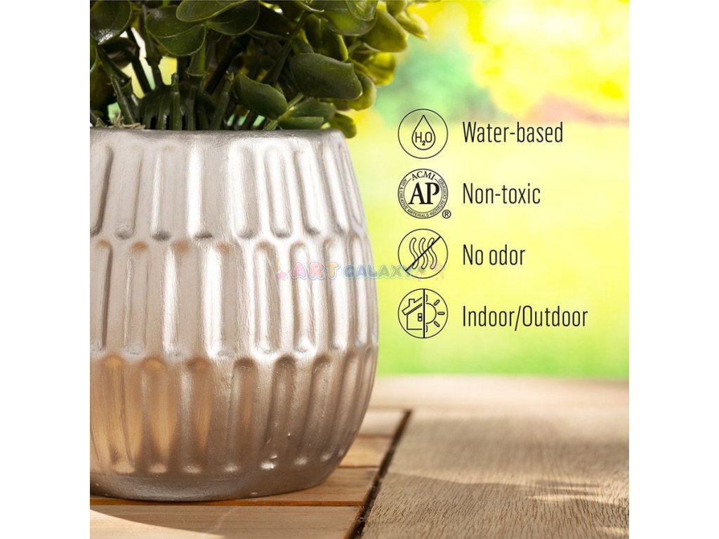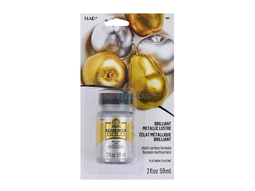 Dodejte svým projektům luxusní vzhled s FolkArt Treasure Platinum akrylovou barvou s intenzivním metalickým leskem. Tato netoxická, vodou ředitelná barva poskytuje úžasný metalický vzhled, který zaručeně dodá vašim dekoracím jedinečný šmrnc. Vhodná pro vnitřní i venkovní projekty, lze ji použít na různé povrchy, jako jsou dřevo, sklo, terakota, plátno, kov a mnoho dalších. Jedna 2 oz lahvička pokryje až 10 čtverečních stop.