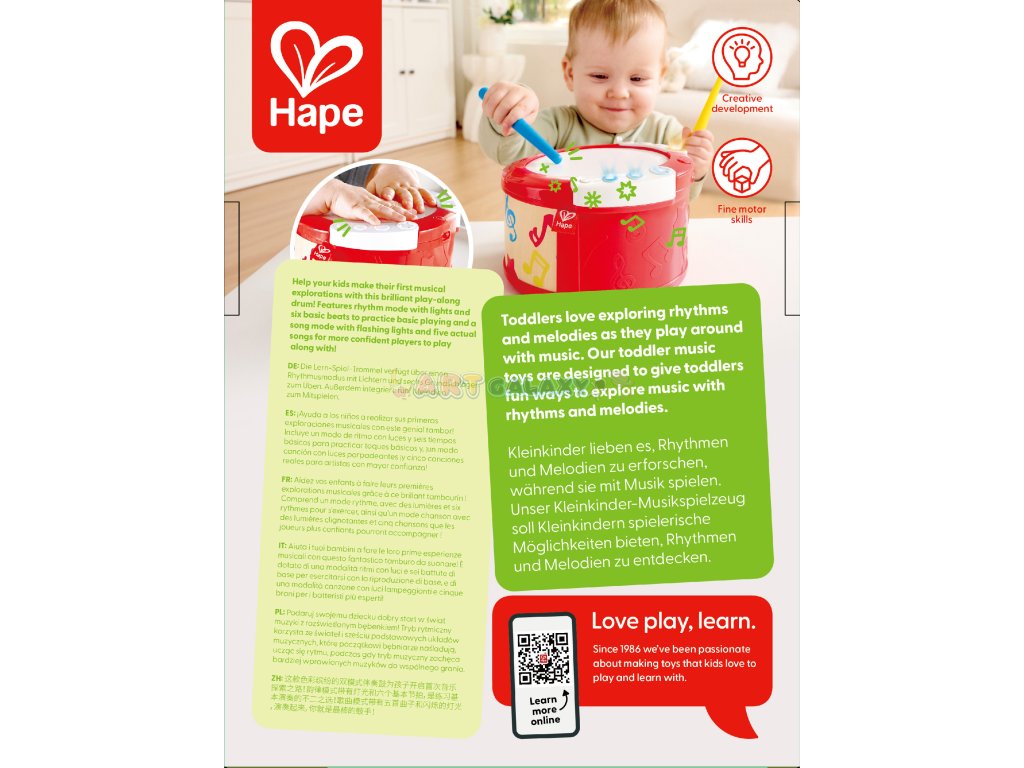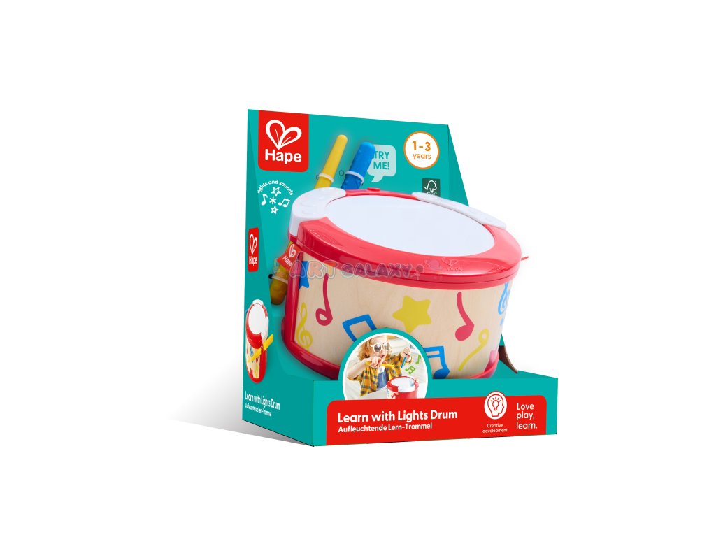 Tato hudební hračka od renomované značky HAPE přináší zábavu a vzdělávání v jednom. Buben se světly reaguje na údery a navádí dítě pomocí svítících bodů, kam bubnovat. Tím rozvíjí nejen hudební sluch, ale i koordinaci pohybu a soustředění.