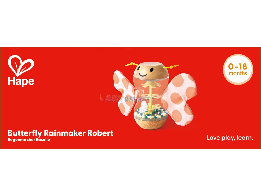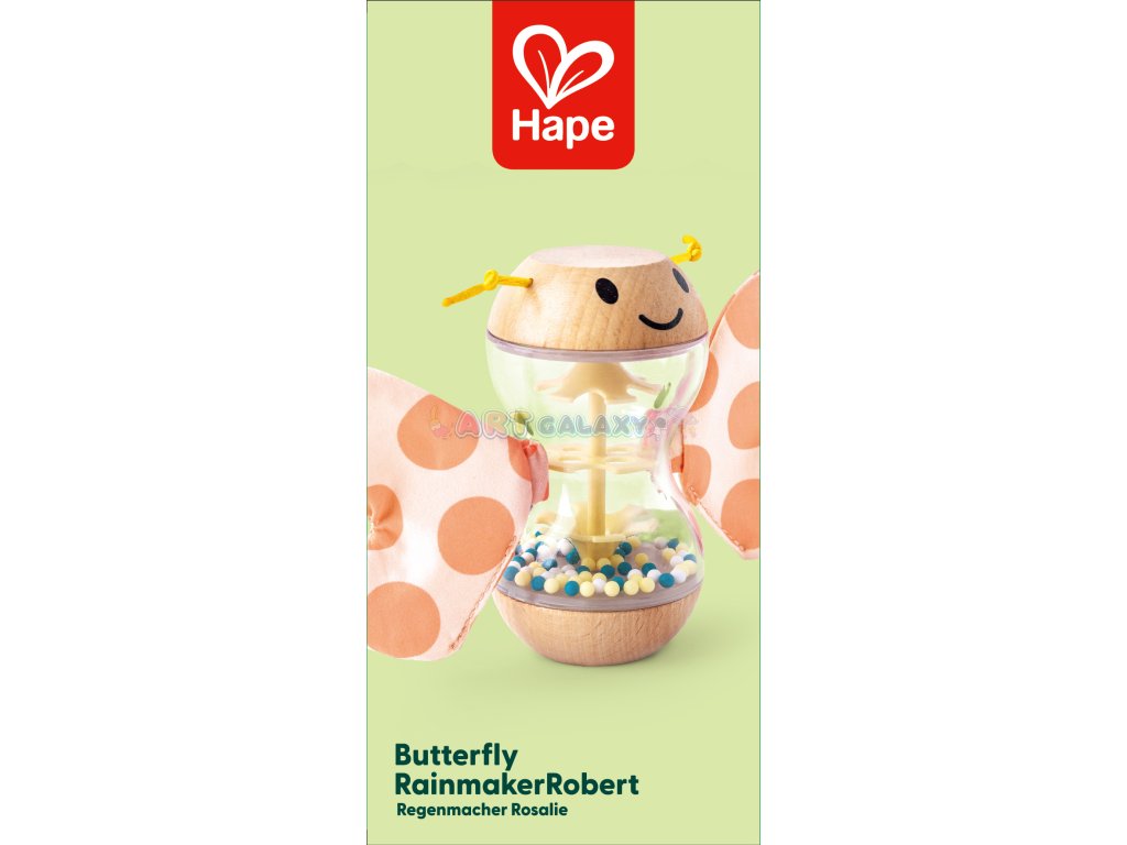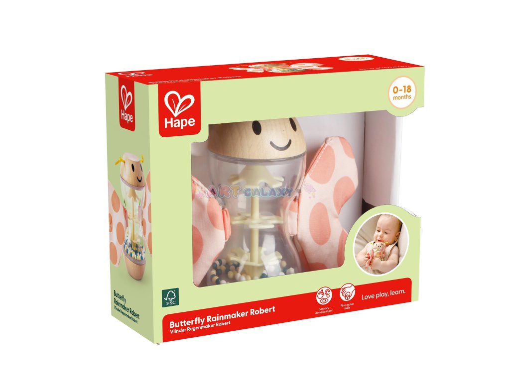 Roztomilé dřevěné chrastítko HAPE ve tvaru motýla Roberta zaujme nejen svým barevným designem, ale i bezpečností a ergonomií přizpůsobenou malým dětským ručičkám. Jemné chrastění a pohyblivé části stimulují smysly a podporují motorický vývoj miminek už od prvních měsíců.