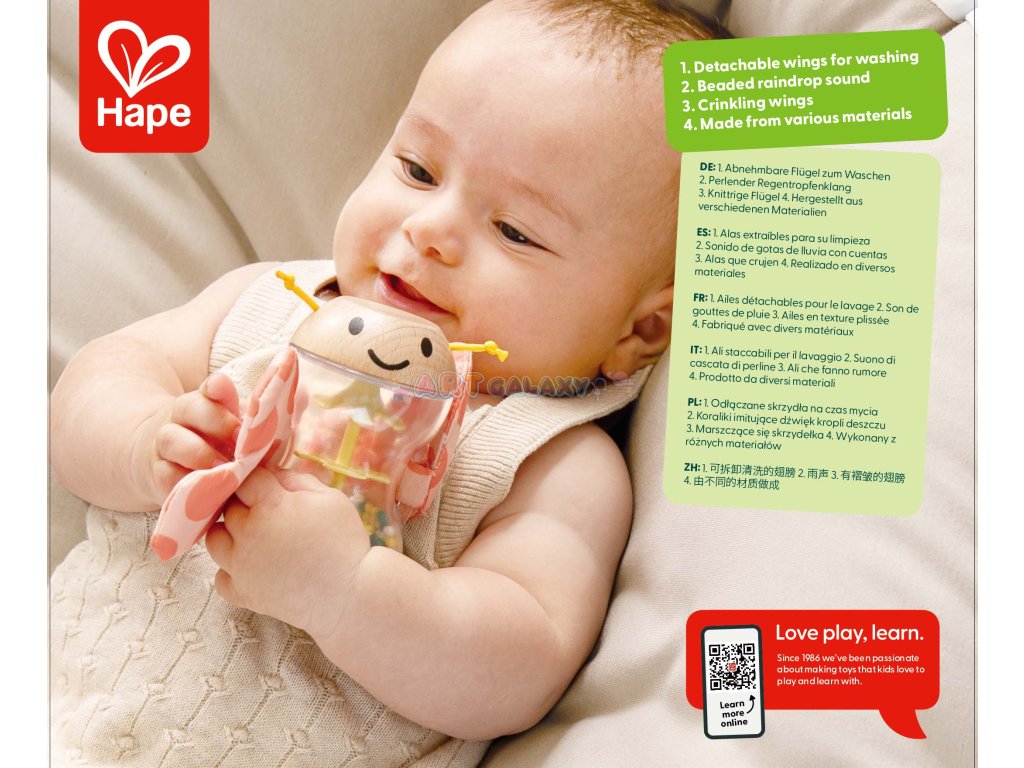 Chrastítko Motýl Robert od značky HAPE kombinuje estetiku, funkčnost a bezpečnost. Jeho barevné křídla zaujmou dětské oči a jemné chrastění stimuluje sluch. Díky ergonomickému tvaru je ideální do malé ručky – snadno se drží a podporuje trénink úchopu. HAPE používá pouze netoxické barvy a dřevo z udržitelných zdrojů, takže je hračka šetrná nejen k dětem, ale i k přírodě.