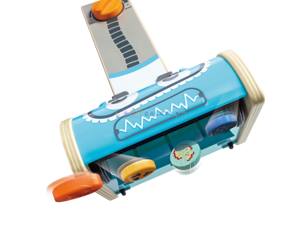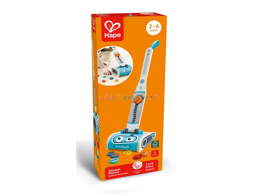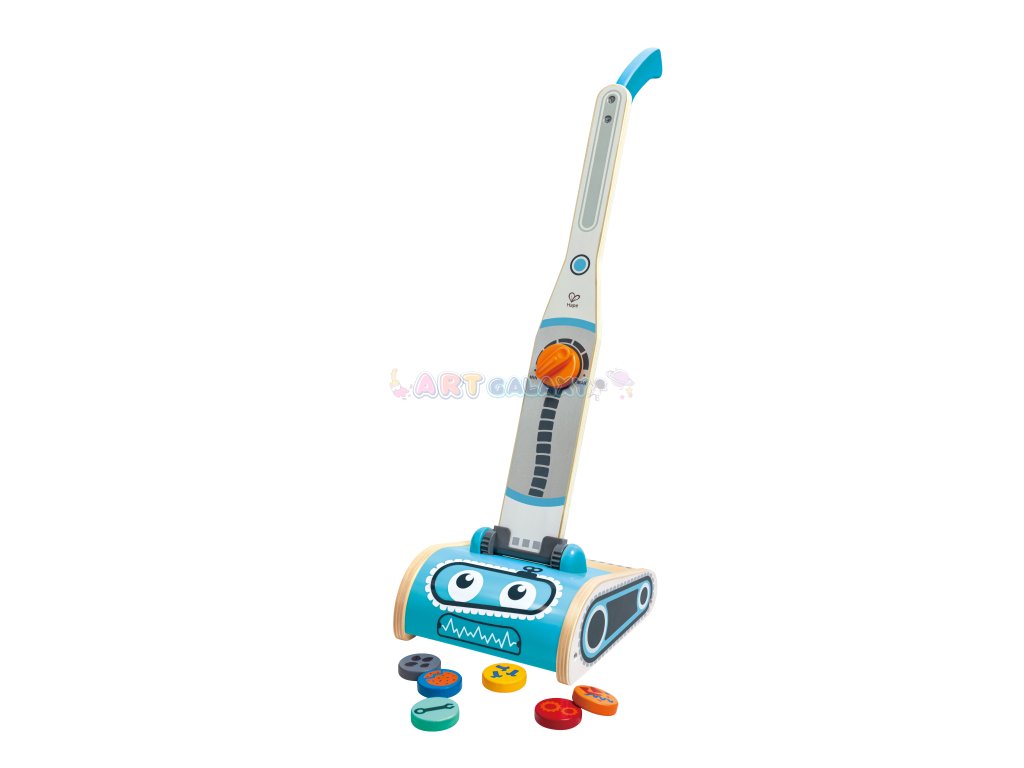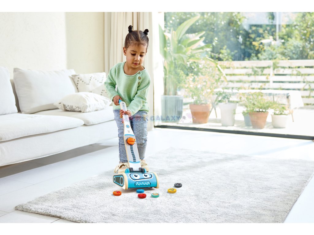 Tento dřevěný vysavač s veselým robotickým obličejem je ideální pro děti, které rády napodobují dospělé. Při přejíždění přes přiložené dřevěné odpadky je "nasává", což dodává hře na realističnosti. Děti si tak rozvíjejí jemnou motoriku, jazykové schopnosti a sociální dovednosti.