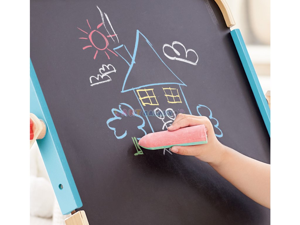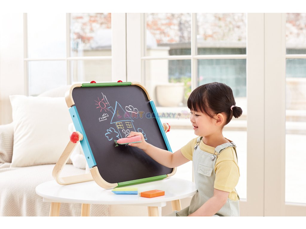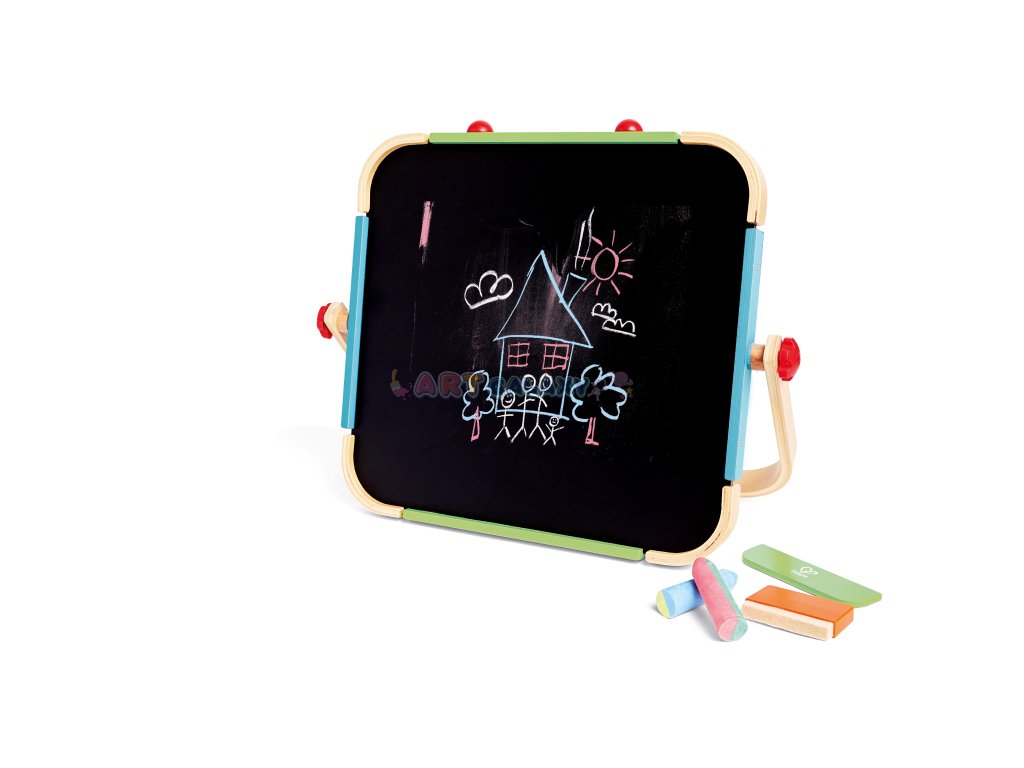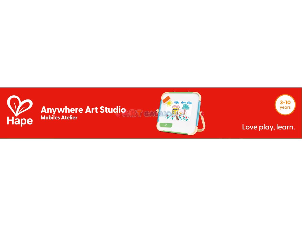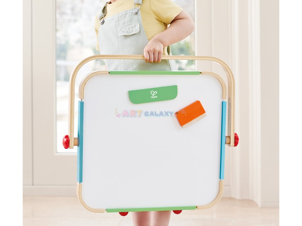 Hape Anywhere Art Studio je ideální pro rodiče, kteří hledají chytré řešení pro kreativní rozvoj dítěte i mimo domov. Studio je lehké, skládací a perfektně přizpůsobené pro použití na stole, podlaze i na cestách. Jedna strana slouží jako bílá magnetická tabule pro popisovače, druhá jako klasická černá tabule na křídu.