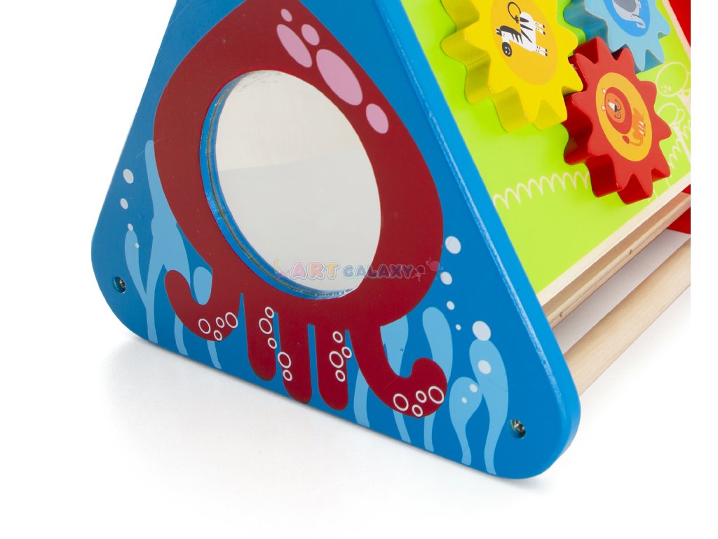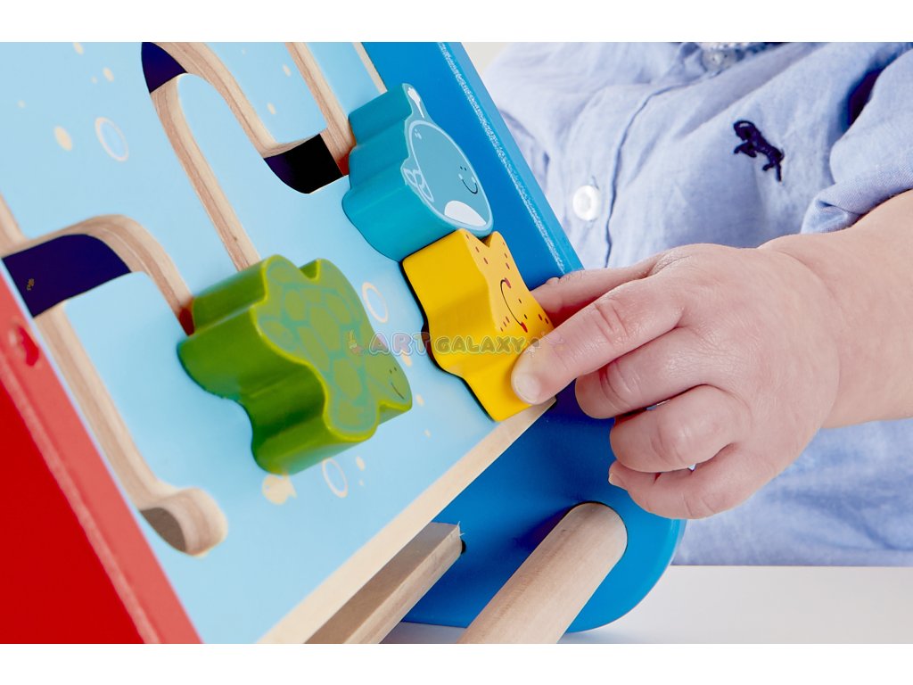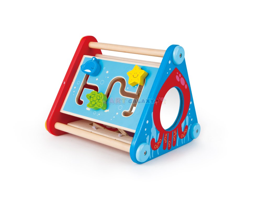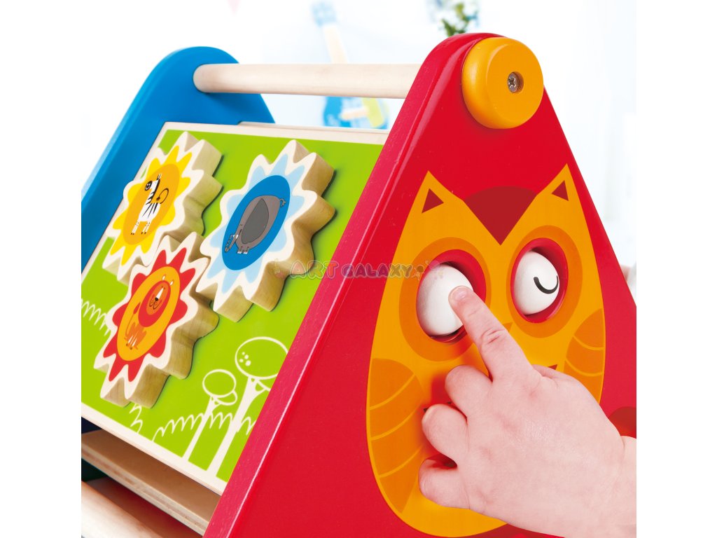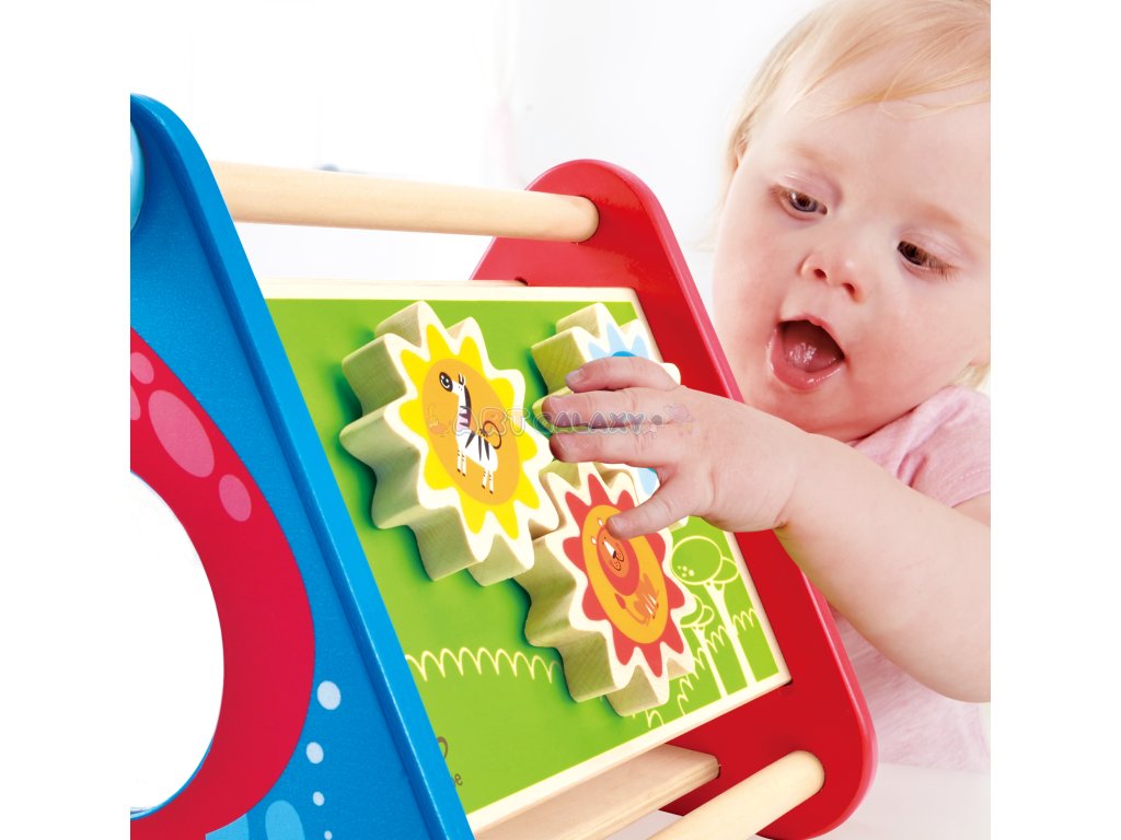 Tato všestranná hračka je navržena speciálně pro nejmenší děti – každá strana boxu nabízí jiný druh zábavy. Dítě si procvičí uchopování, otáčení, vkládání, pozorování i první poznávání příčin a následků. Díky tomu rozvíjí nejen jemnou motoriku, ale také logické uvažování a smyslové vnímání.
