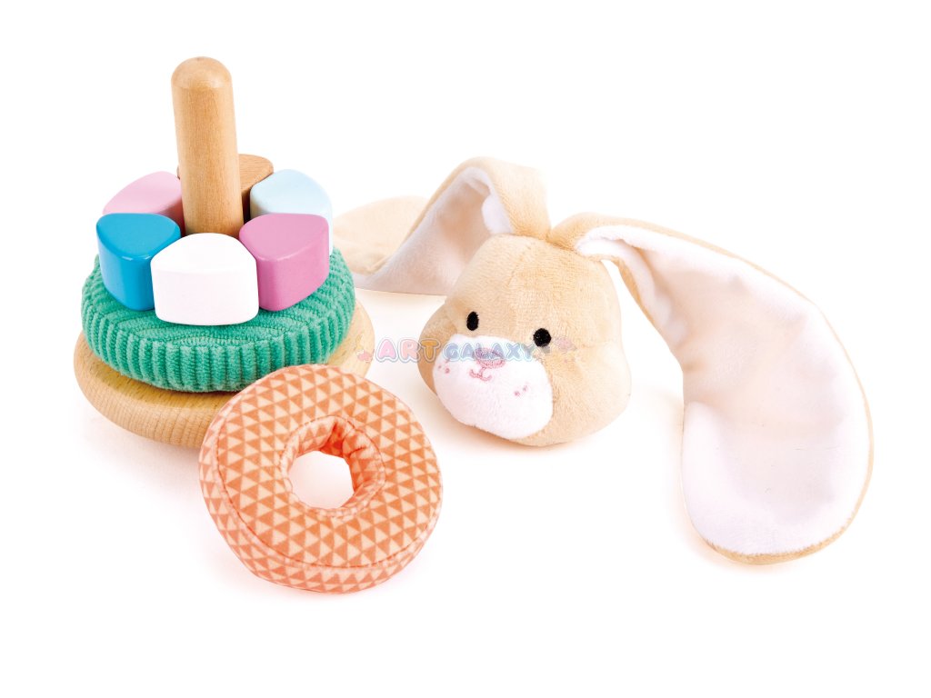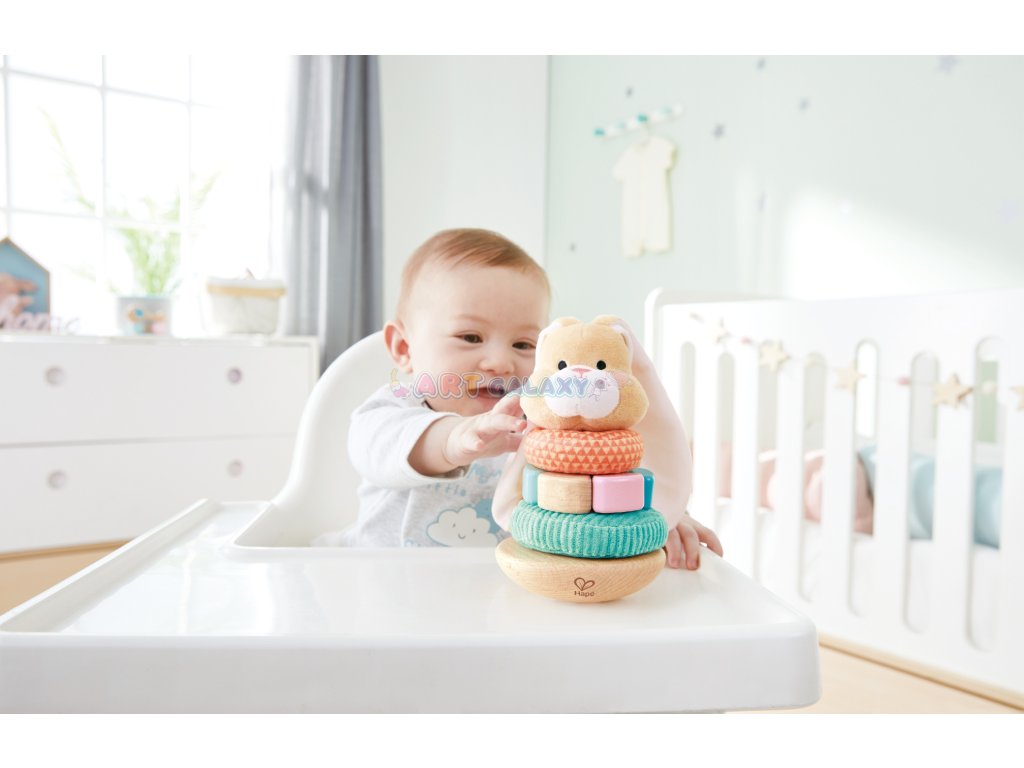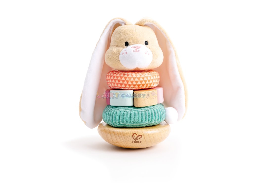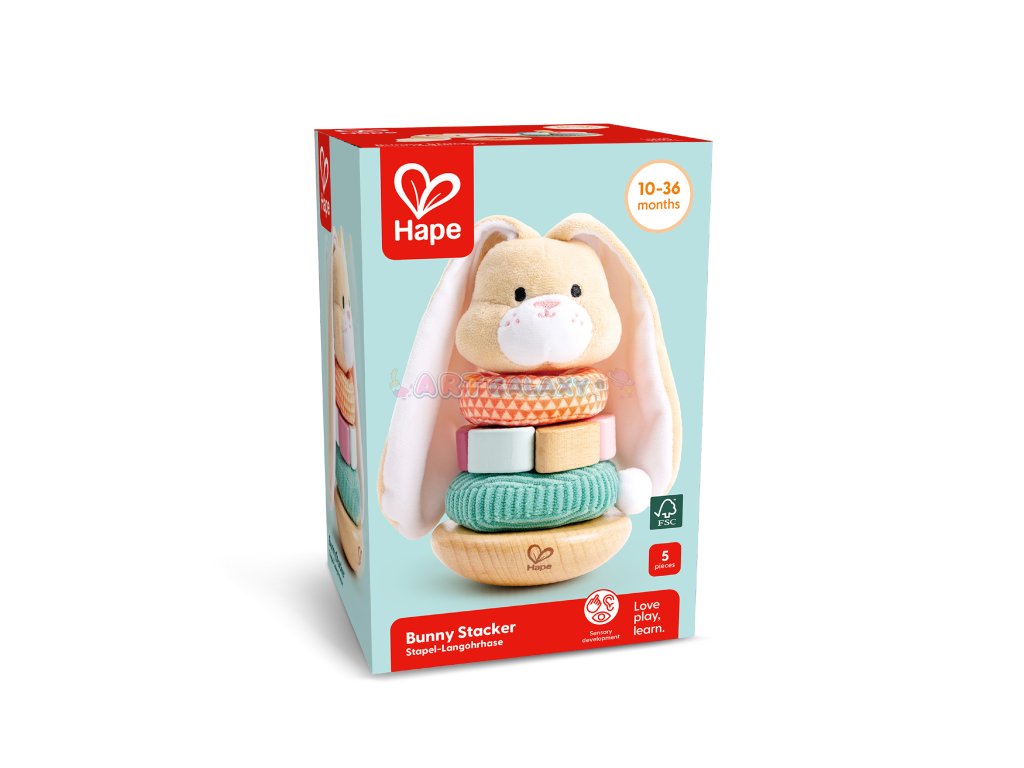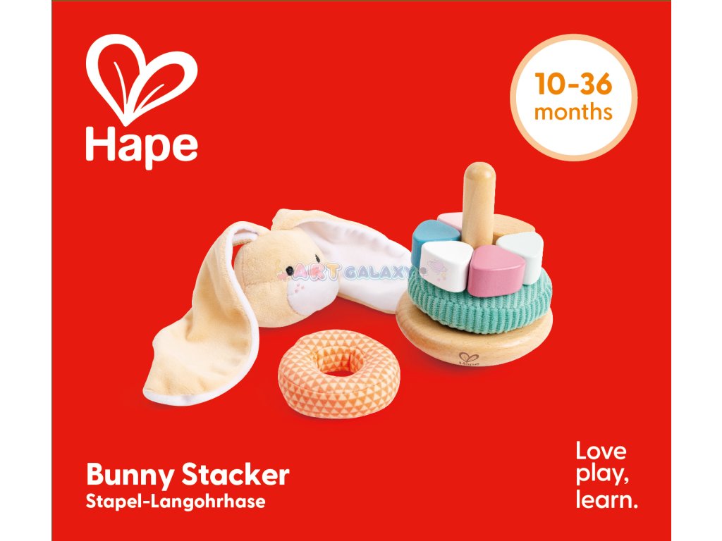 Zajíček Bunny Stacker od HAPE přináší klasickou skládací věž v moderním a hravém provedení. Dítě si zábavnou formou procvičuje motorické dovednosti tím, že navléká barevné dřevěné kroužky na tyč, až vznikne postavička zajíčka.