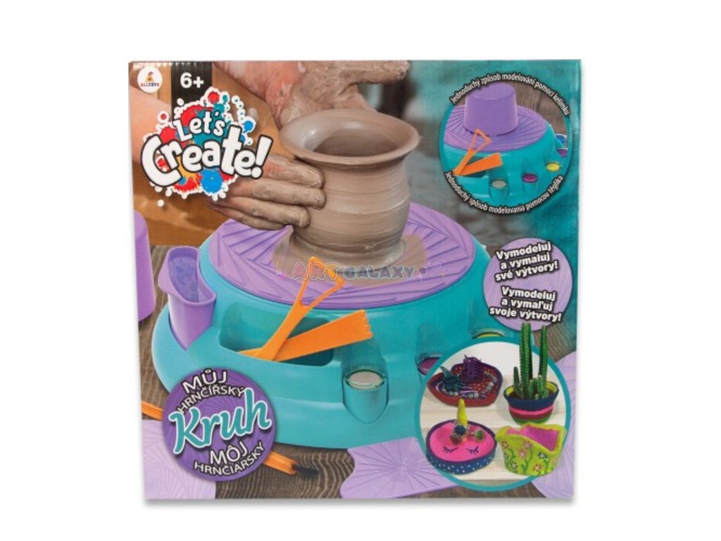 - Obsah balení: Hrnčířský kruh, 2 stylingové nástroje, nástroj na vyhlazování hran, šablona na nádobu, držák nástrojů, hlína schnoucí na vzduchu, 6 barev, štětec, příručka