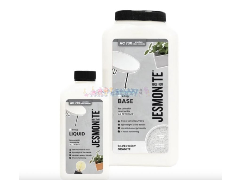 Kompletní sada Jesmonite AC730 – Silver Grey Granite je perfektní volbou pro tvorbu estetických a odolných designových výrobků. Sada obsahuje 2,5 kg Jesmonite Base s texturou inspirovanou stříbrnou žulou a 500 g Jesmonite Liquid, což je vše potřebné k míchání a vytvoření hotového materiálu.