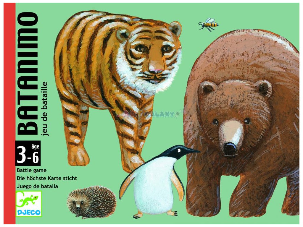 Extrémně jednoduchá karetní hra ze světa zvířátek. Karetní hra – Djeco – Batanimo je vhodná pro děti od 3 do 6 let. Je pro 2 - 4 hráče a principem hry klasický souboj, vyhrává ten, kdo má silnější zvíře na kartě. Ale pozor, pokud se střetnou stejně silná zvířata – následuje nelítostný souboj. Nádherný design od francouzských umělců pod značkou Djeco vás pobaví originálními ilustracemi výjevů ze zvířecího světa. Karetní souboj menším dětem usnadňuje i barevný metr, podle kterého děti jasně poznají, které zvíře je silnější. Je to ideální hra pro školní výlety, školy v přírodě nebo na dovolenou. Rádi si zahrají i dospělí. Probouzí se bystrost, schopnost se soustředit, karty povzbuzují k vzájemné konverzaci a užijete si spoustu zábavy. Karty jsou z kvalitního tvrzeného kartonu, odolné proti opotřebení nebo roztrhání.