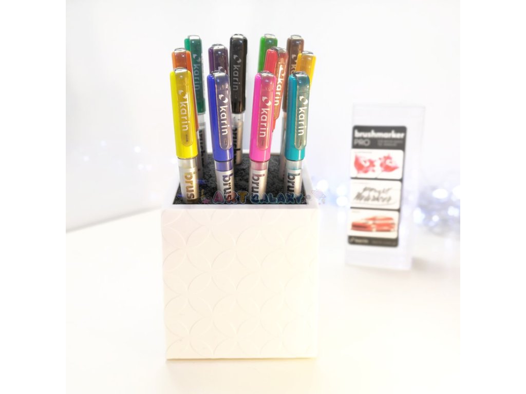 Karin Brushmarker Pro jsou jedinečné akvarelové fixy na vodní bázi. Fixy mají kvalitní štětcový hrot a 72 odstínů, které je možné vzájemně míchat a nechat vzniknout dalším odstínům. Popisovače jsou vyráběny technologií “tekutý inkoust” a díky tomu umožňují 100% spotřebu barvy. Jedinečný akvarelový inkoust má intenzivní kvalitní barvy a velmi odolný a flexibilní nylonový štětcový hrot vhodný jak pro moderní kaligrafii, tak pro malbu, kde je možné je rozpíjet vodou. Brushmarkers Karin jsou vyrobeny v Japonsku.