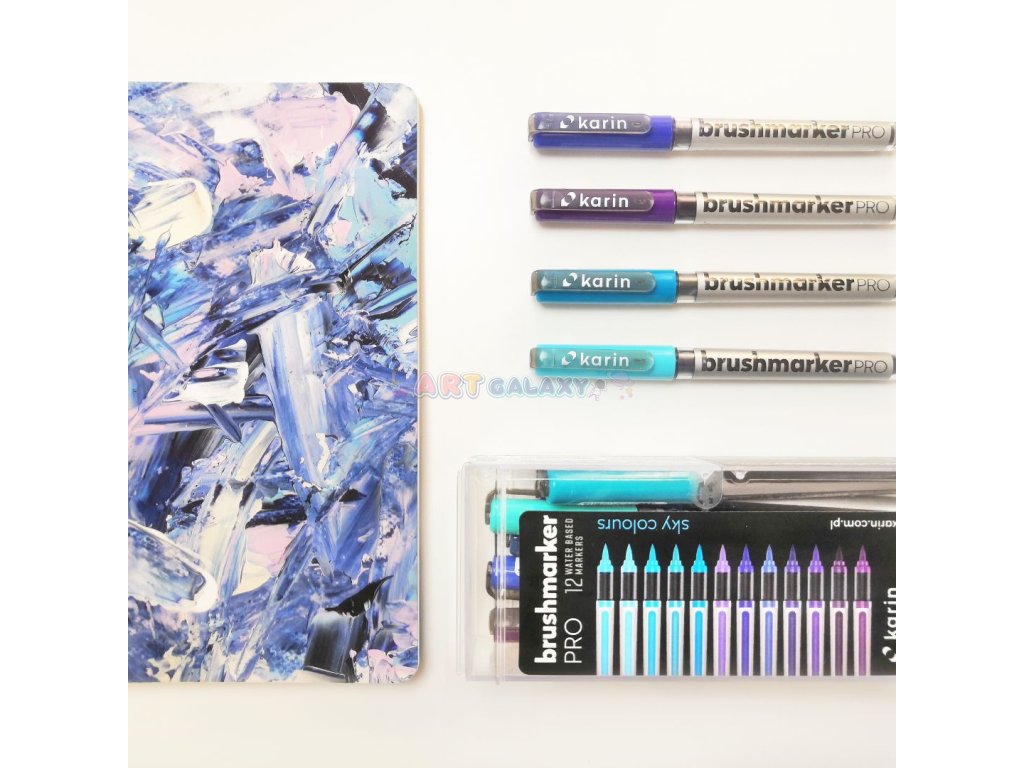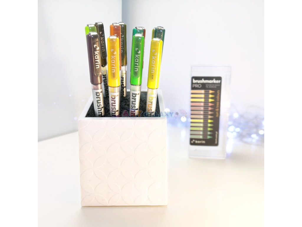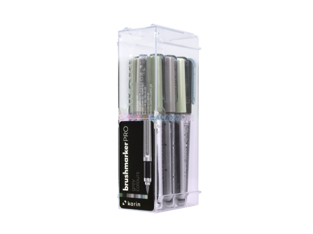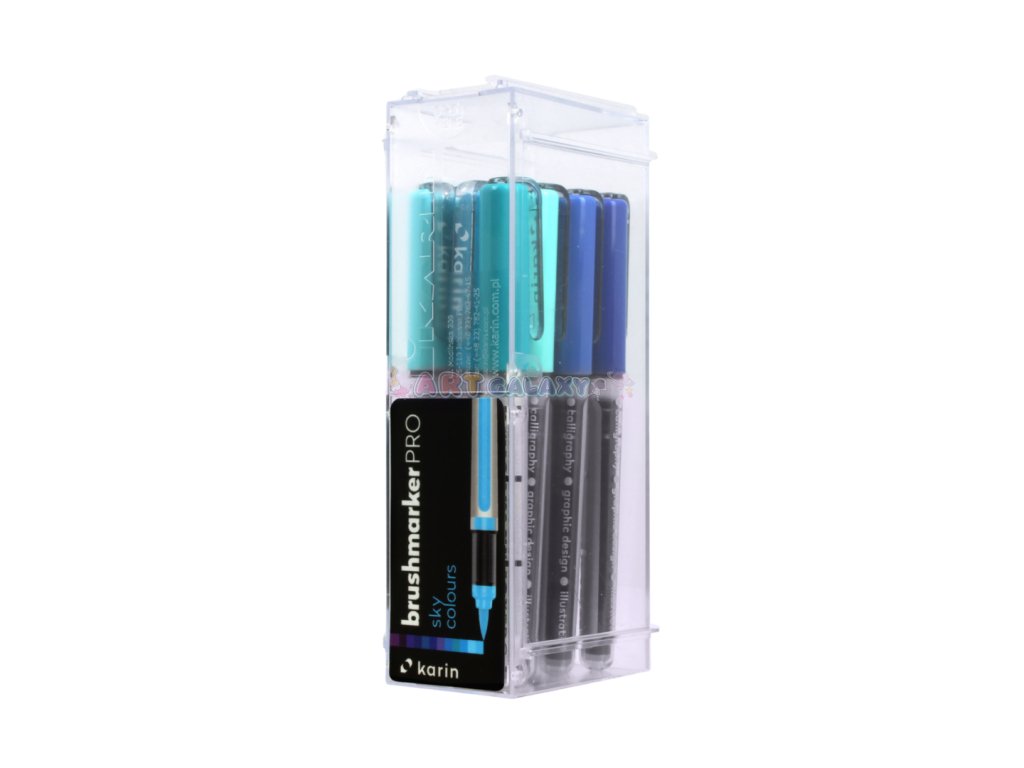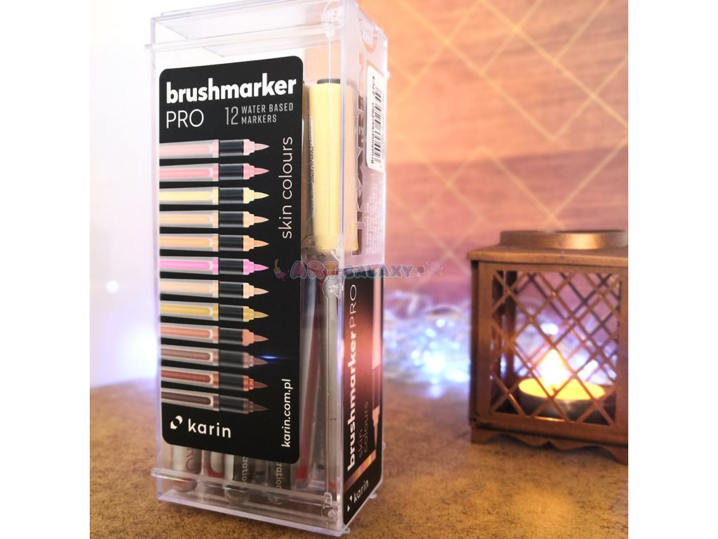 Karin Brushmarker Pro jsou jedinečné akvarelové fixy na vodní bázi. Fixy mají kvalitní štětcový hrot a až 72 odstínů, které je možné vzájemně míchat a nechat vzniknout dalším odstínům. Popisovače jsou vyráběny technologií “tekutý inkoust” a díky tomu umožňují 100% spotřebu barvy. Jedinečný akvarelový inkoust má intenzivní kvalitní barvy a velmi odolný a flexibilní nylonový štětcový hrot vhodný jak pro moderní kaligrafii, tak pro malbu, kde je možné je rozpíjet vodou. Brushmarkers Karin jsou vyrobeny v Japonsku.