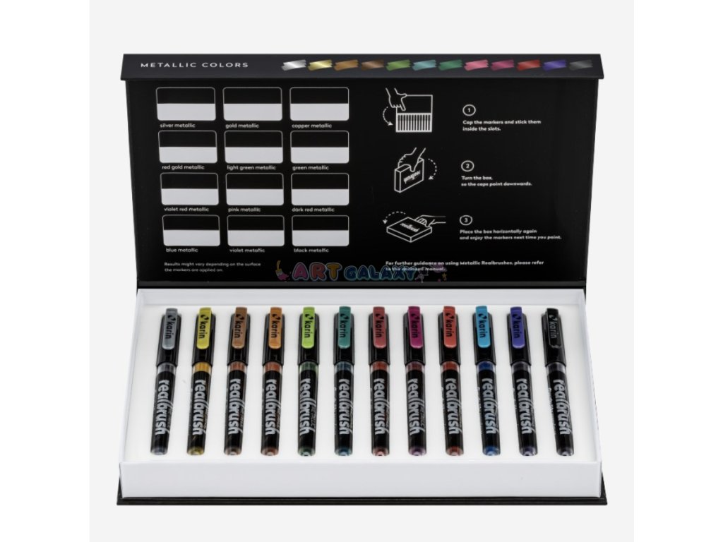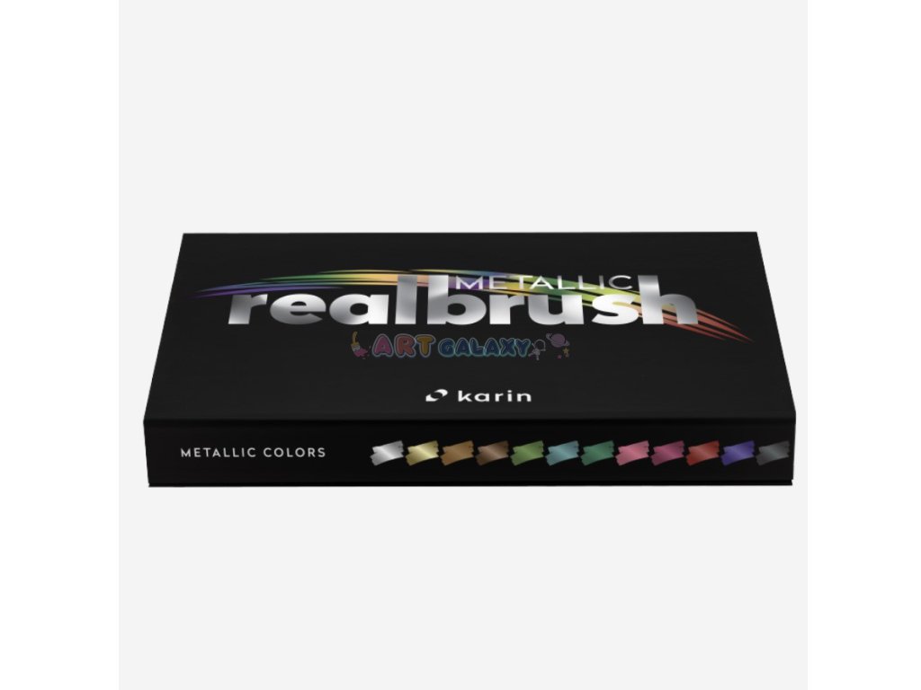 Rozzařte své umělecké projekty s KARIN REAL BRUSH METALLIC 12 ks SET! Tento set obsahuje 12 metalických barev, které dodají vašim kresbám a malbám jedinečný lesk a hloubku. Flexibilní štětečkové hroty a intenzivní pigmenty zajišťují snadnou aplikaci a skvělé výsledky.