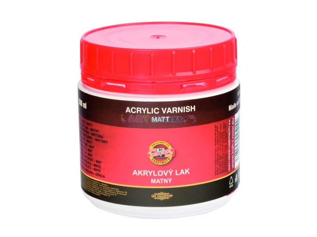 Akrylový lak značky KOH-I-NOOR se používá jako závěrečný lak na malbu akrylovými barvami, vytváří po zaschnutí matný bezbarvý transparentní tvrdý film chránící malbu před poškozením. Po ošetření lakem se malba i lépe čistí např. od prachu. Lak má tekutou matnou strukturu, nanáší se tenká vrstva laku pomocí štětce (dobře rozetřít). Po zaschnutí lak zprůhlední a stane se transparentním. Je bezbarvý, bezzápachový, vytváří tvrdý film na povrchu, nemění odstíny malby a nežloutne vlivem světla. Lak je rychleschnoucí a po zaschnutí voděodolný, tak je vhodné použité štětce ihned vymýt vodou, případně potřísněná místa ihned omýt vodou s mýdlem. Baleno v plastové plechovce se šroubovatelným víkem.