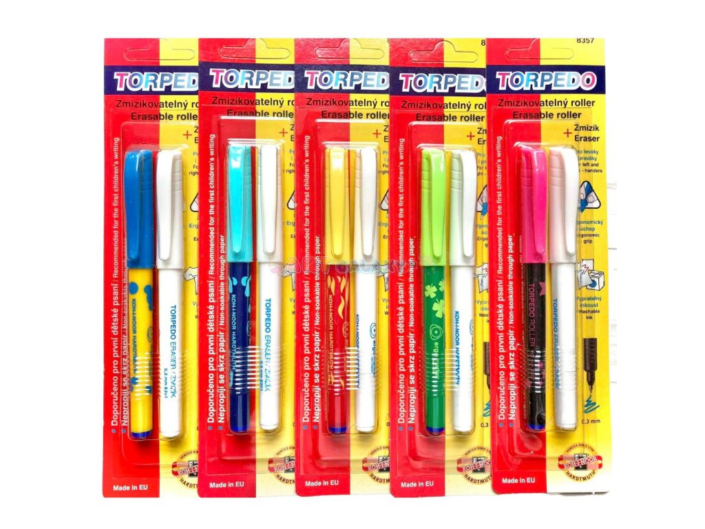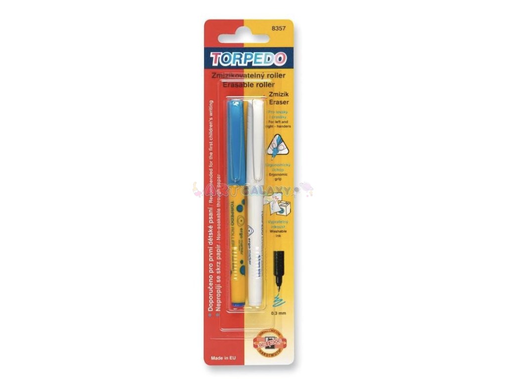 Roller Torpédo zn. KOH-I-NOOR je ideální mezi-článek mezi plnícím perem a klasickou propiskou. Je vhodné pro mladší školáky na prvních stupních, milovat ho ale budou i ti starší žáci a studenti. Zde ho máme v sadě i se zmizíkem! Roller je lehký a má ergonomický úchop, který ulehčuje jeho držení a omezuje únavu dětské ruky, navíc je vhodný i pro leváky a dysgrafiky. Roller má též bezpečnostní víčko, které při případném vdechnutí umožňuje dýchání. Rollery mají modrý inkoust, který je možné vyprat, děti ho také mohou za pomoci zmizíku z papíru vymazat (což učitelé nevidí rádi), jeho výhodou je, že nepropíjí. Torpédo je tedy skvělým pomocníkem a průvodcem při začátcích psaní! Jak se s rollerem píše, se můžete podívat na našem videu zde.