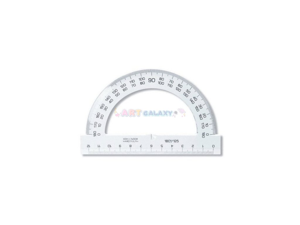 Úhloměr zn. KOH-I-NOOR je pomůcka vhodná do hodin geometrie a na změření velikosti úhlů. Mimo dvou úhloměrných stupnic na oblouku je na přeponě natištěna 120 mm dlouhá délková stupnice, která může sloužit jako krátké pravítko, skvělá je i praktická průhlednost úhloměru. Tisk stupnic na úhloměru je odolný proti opotřebení při běžném používání. Úhloměr je určený k rýsování a technickému kreslení jak ve škole, tak i v kanceláři. Zabalen je do polyetylenového sáčku s eurozávěsem.