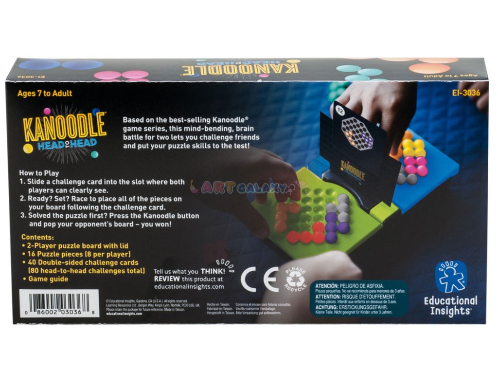 Tato soutěžní verze hry Kanoodle přináší napínavou zábavu pro dva hráče. Cílem je co nejrychleji složit prostorový hlavolam podle zadané karty. Kdo stiskne tlačítko jako první, vyhrává kolo!